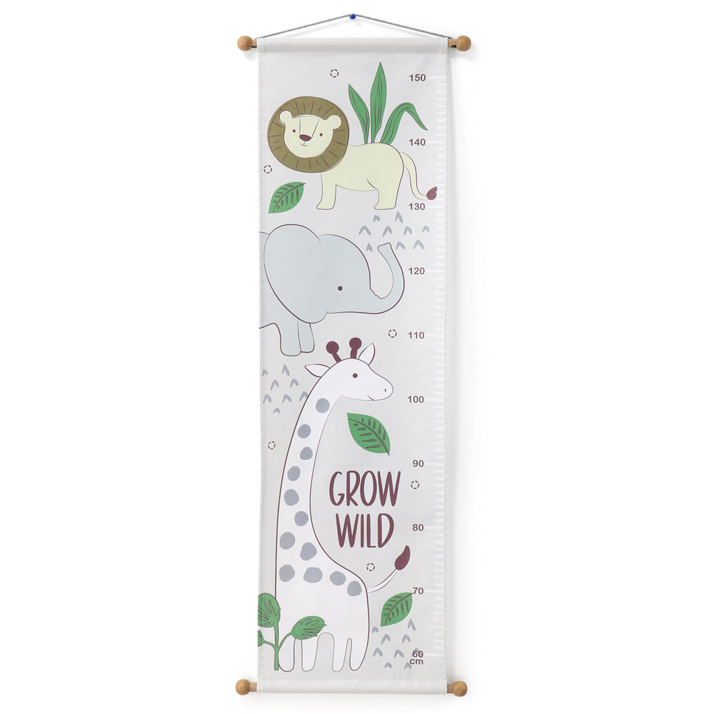 Track how much your little one has grown with our safari themed growth chart. Featuring an adorable stack of safari animals and leaves printed on canvas with easy to read large centimetre markings, this charming design adds a splash of whimsical fun to your child's room. The wood dowel and string mount make this easy to hang in a doorway or other space in your home. The chart goes from 60 cm up to 150 cm tall so you can keep track of their growth for years to come.