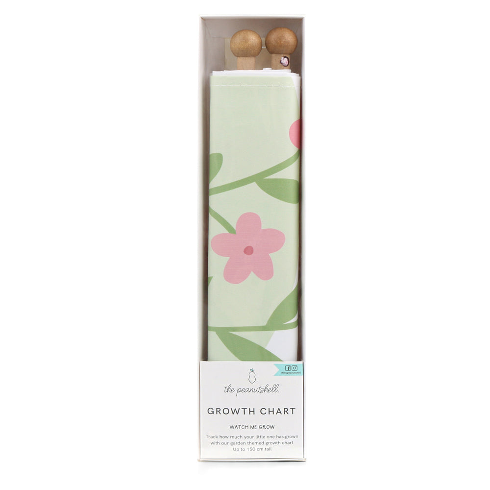 Track how much your little one has grown with our garden themed growth chart. Featuring a trail of pretty pink butterflies and flowers printed on canvas with easy to read large centimetre markings, this gorgeous design adds a splash of whimsical fun to your child's room. The wood dowel and string mount make this easy to hang in a doorway or other space in your home. The chart goes from 60 cm up to 150 cm tall so you can keep track of their growth for years to come.