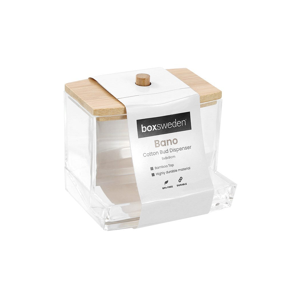 Organise your bathroom in style with the Boxsweden Bano Cotton Bud Dispenser With Bamboo Lid.