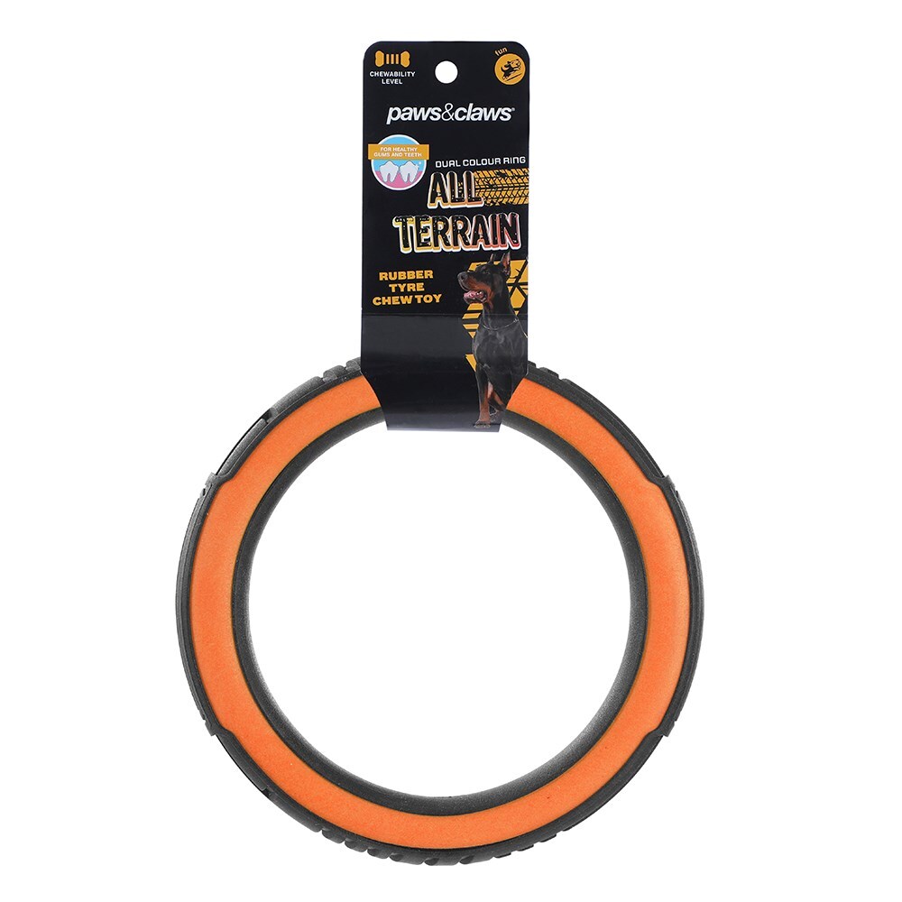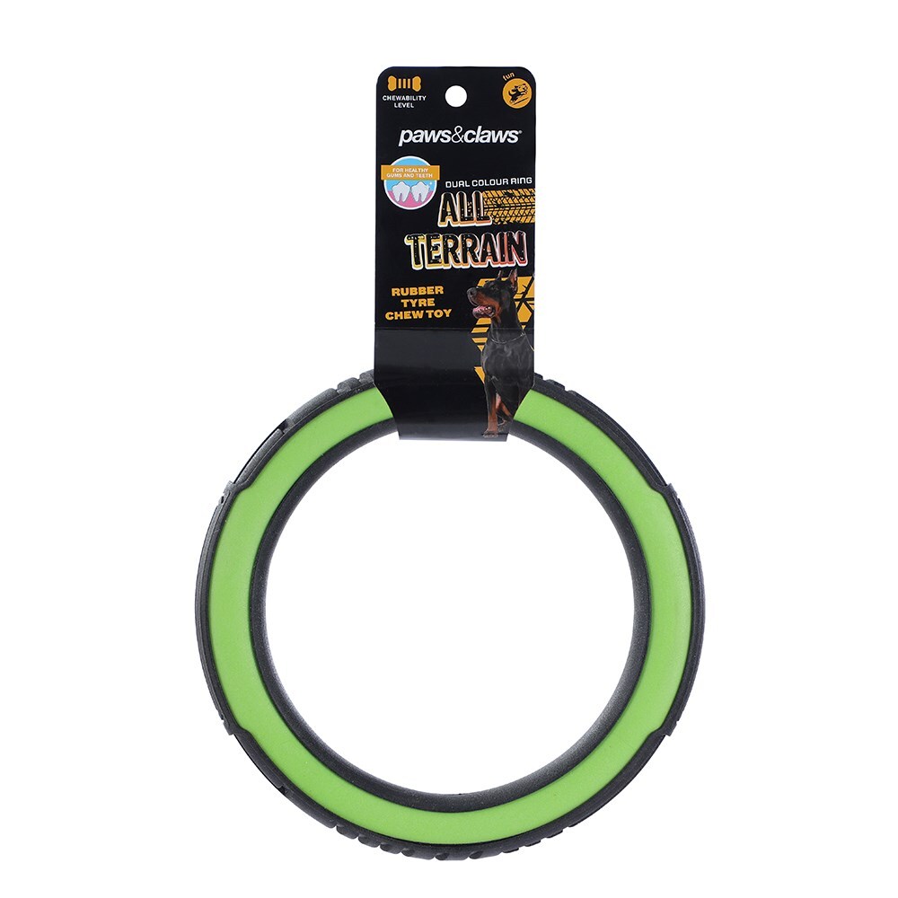 Satisfy the tough chewers with our Paws & Claws All Terrain Dual Colour Chew Ring! Made from heavy duty rubber, this toy features built in grooves that work to clean your pet’s teeth as they chew. Plus, the ring design makes it perfect for playing fetch!