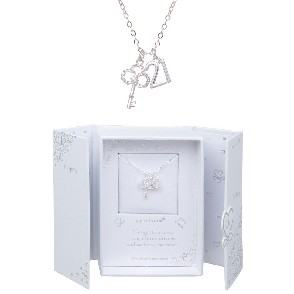 Equilibrium silver plated 21st birthday necklace.A keepsake to treasure in a beautiful gift box. Wording on box is Happy 21st..congratulations, may all your dreams and wishes come true.