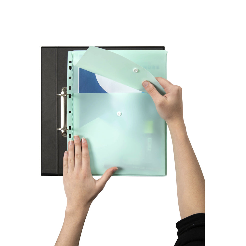 The Marbig binder wallet makes filing easy with its top button closure and is offered in a variety of popular pastel colours.