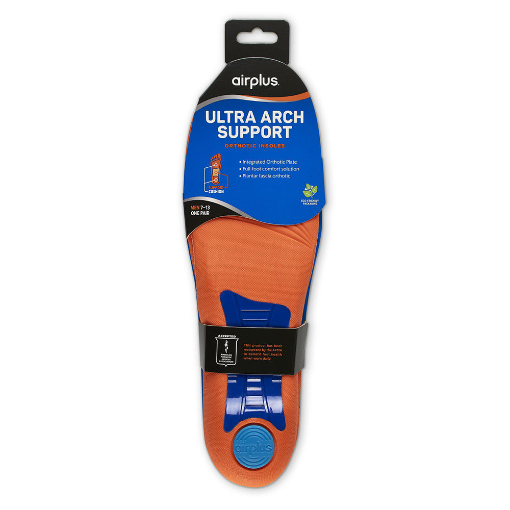 The Airplus Ultra Arch Orthotic Insole is designed for anyone looking for more arch support. The full length design includes an exclusive Airplus arch bridge to provide comfort for those with arch issues, including fallen arches or flat feet. A deep heel cup helps secure and stabilize the foot while an extra gel layer in the heel helps provide cushioning. The Airplus Ultra Arch Orthotic Insole offers full-foot comfort for daily wear.