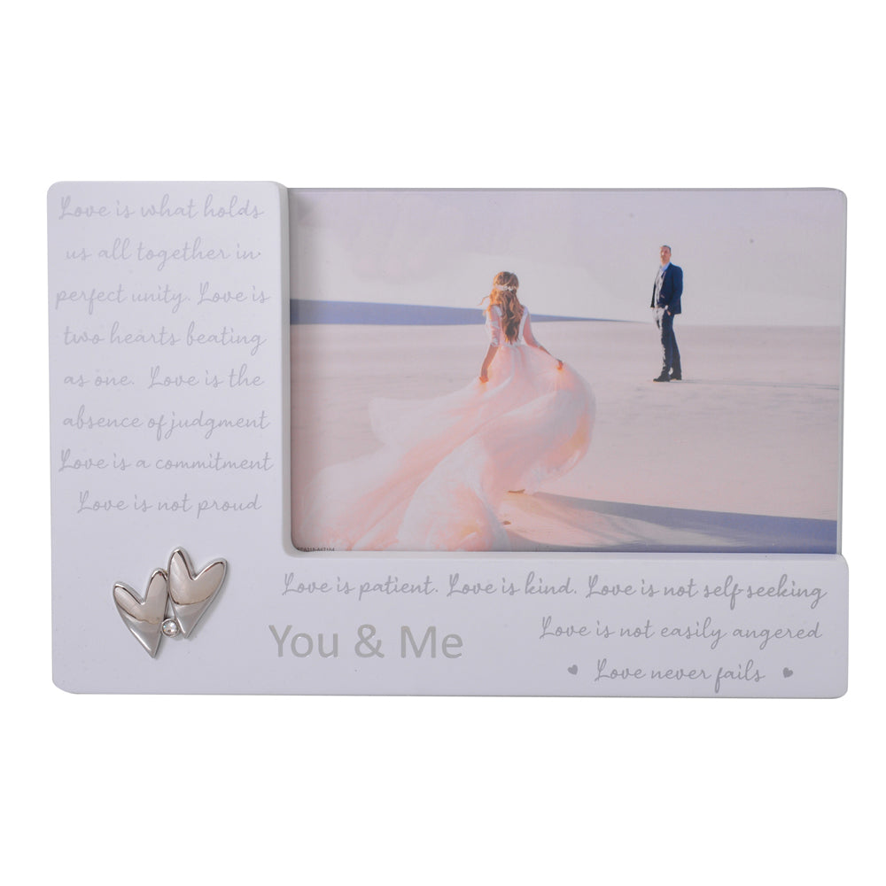 Introducing the perfect way to cherish your most treasured memories: our elegant Silver Love Hearts Frame. Designed to hold a 4x6 photo, this exquisite frame is adorned with two intricate love hearts details that add a touch of romance and sophistication to any space. What makes this frame truly special is the heartfelt love verse delicately inscribed on it, capturing the essence of love and making it an ideal gift for weddings, anniversaries, or just because. The white and silver finish complements any decor, ensuring your photo takes centre stage while being beautifully framed. Celebrate your love story and immortalize your precious moments with the Silver Love Hearts Frame – a timeless keepsake that speaks the language of the heart.