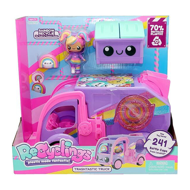 Introducing the Trashtastic Truck! Made from 70% recycled plastic bottle caps, this fantastic playset stops 241 bottle caps from going into landfills! Captained by the Trash to Treasure Queen Rainbow Recyclie, who drives the truck around in search of rubbish to repurpose. . . and Recyclings to play with!