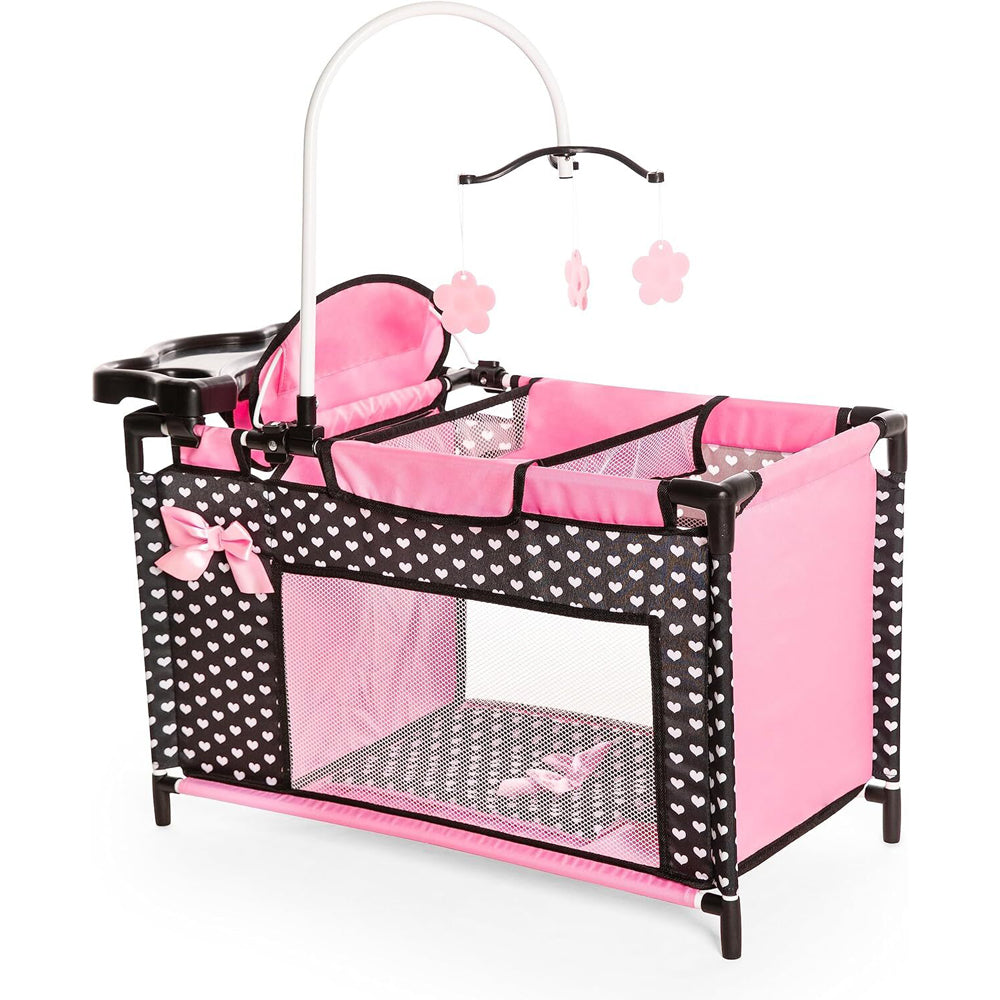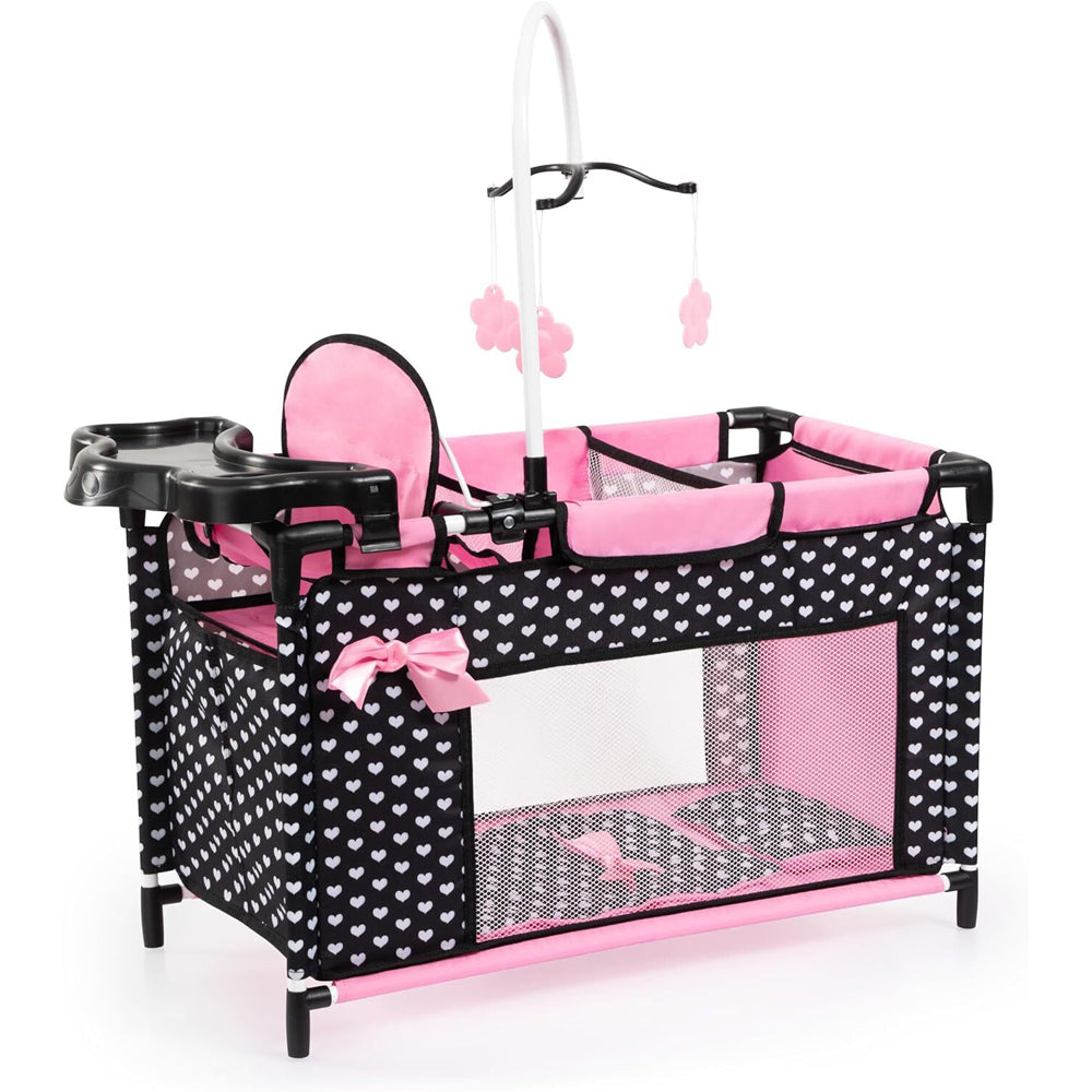 Introducing the versatile multi-bed, a must-have accessory for endless playtime adventures with your child's dolls. This lovely black with pink hearts bed offers a multitude of play possibilities, ensuring hours of imaginative fun. Equipped with an integrated highchair, dolls can be comfortably fed thanks to the convenient dining tray. Plus, a compartment with a Velcro fastener provides ample storage space for all the doll's accessories, keeping them neatly organized and easily accessible. With three included hangers, dolls' clothes can be hung up for added realism and organization.