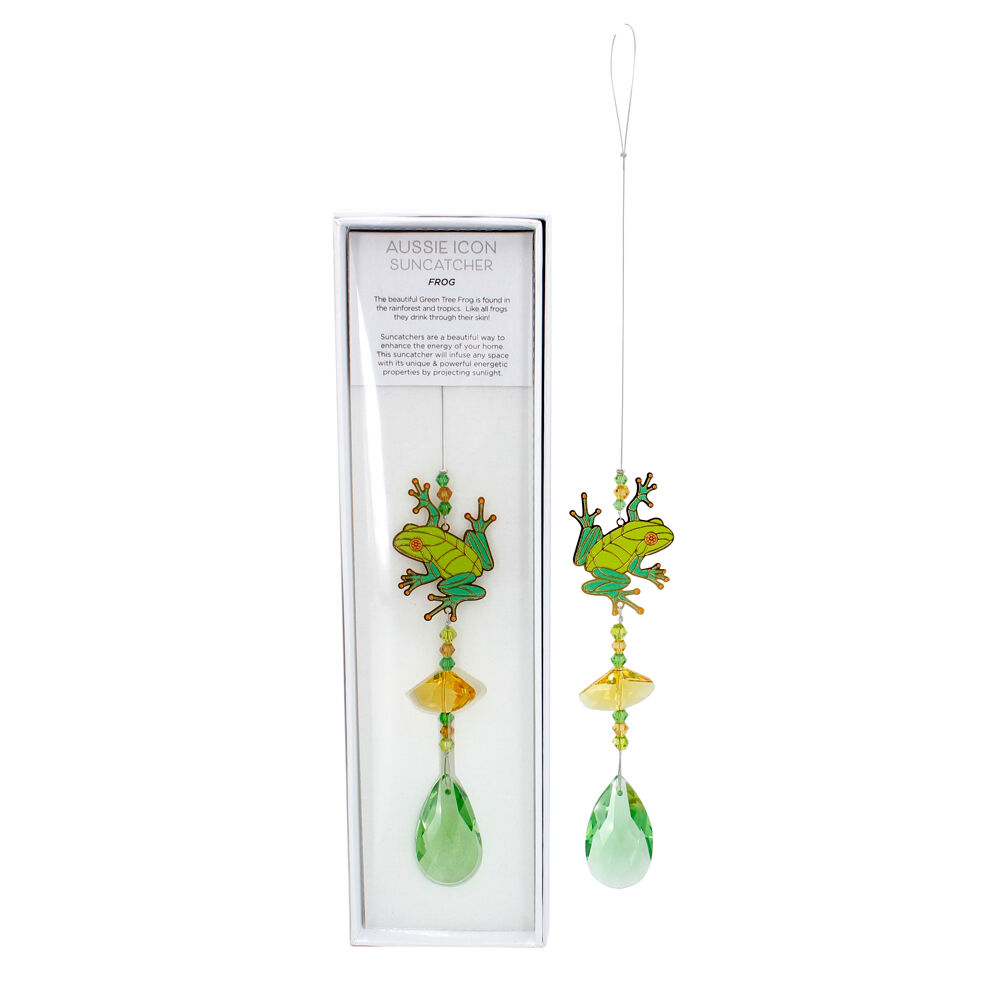Eternity Crystals Aussie Icons Suncatcher - Frog this beautiful green tree frog is found in the rainforest and tropics like all frogs they drink through their skin. Suncatchers are a beautiful way to enhance the energy of your home this suncatcher will infuse any space with its unique and powerful energetic properties by projecting sunlight. Featuring a hanging trinket, this exquisite piece adds a touch of elegance to any room. Crafted with precision and elegance, this trinket is perfect for displaying your love for iconic Australian symbols.