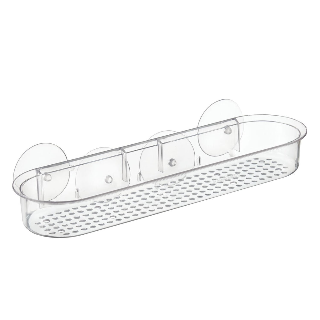 The iDesign Shower Suction Basket is perfect for adding extra storage wherever you need it. Made of clear, durable plastic, this shower caddy will provide years of quality use. Four super strong suction cups adhere to smooth, non-porous shower surfaces bathtub wall, tile, glass, fiberglass, or even metal to hold sponges, scrubbers, bars of soap, shampoo bottles, conditioner bottles, razors, and more in your shower. The ventilated design allows water to drain while your sponges and scrubber dry. Stick to your kitchen sink for convenient storage. Each iDesign Shower Suction Basket , perfect for your home.