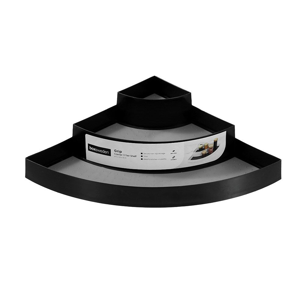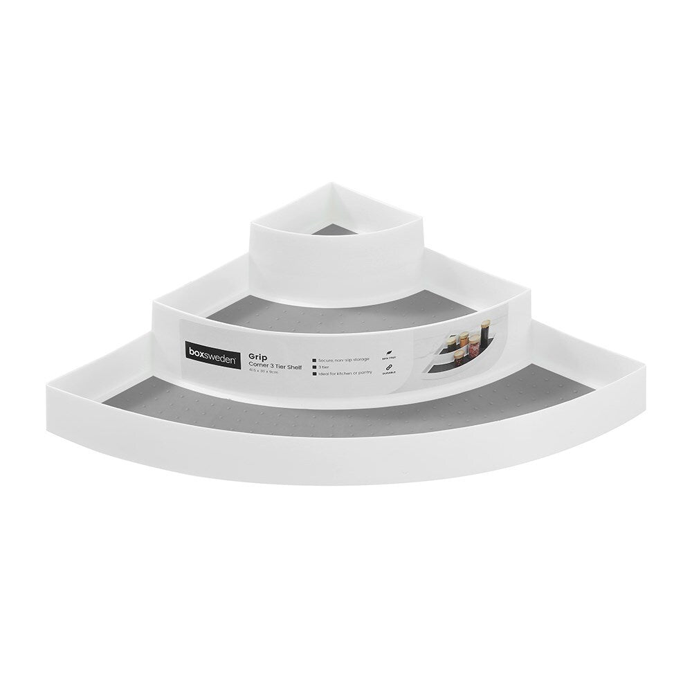 Our Boxsweden Grip 3 Tier Corner Shelf is a simple yet innovative solution to making the most of your kitchen cabinets and shelves. Made from sturdy, BPA-free plastic, this corner shelf features a non-slip base and three shelves for easy access and visibility of jars, condiments, cans, spices and more. Perfect for pantry use or in kitchen cupboards as it can fit most shelf spaces and is easy to clean.