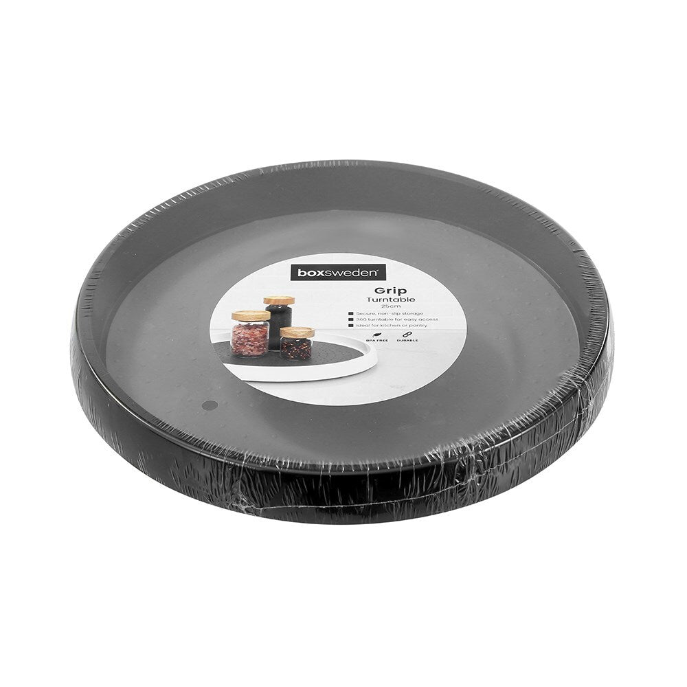 Our Boxsweden Grip Turntable is a simple yet innovative solution to making the most of your kitchen cabinets and shelves. Made from sturdy, BPA-free plastic, this turntable features a non-slip base and 360 degree swivel design for easy access and visibility of jars, condiments, cans, spices and more. Perfect for pantry use or in kitchen cupboards as it fits most shelf spaces and is easy to clean.