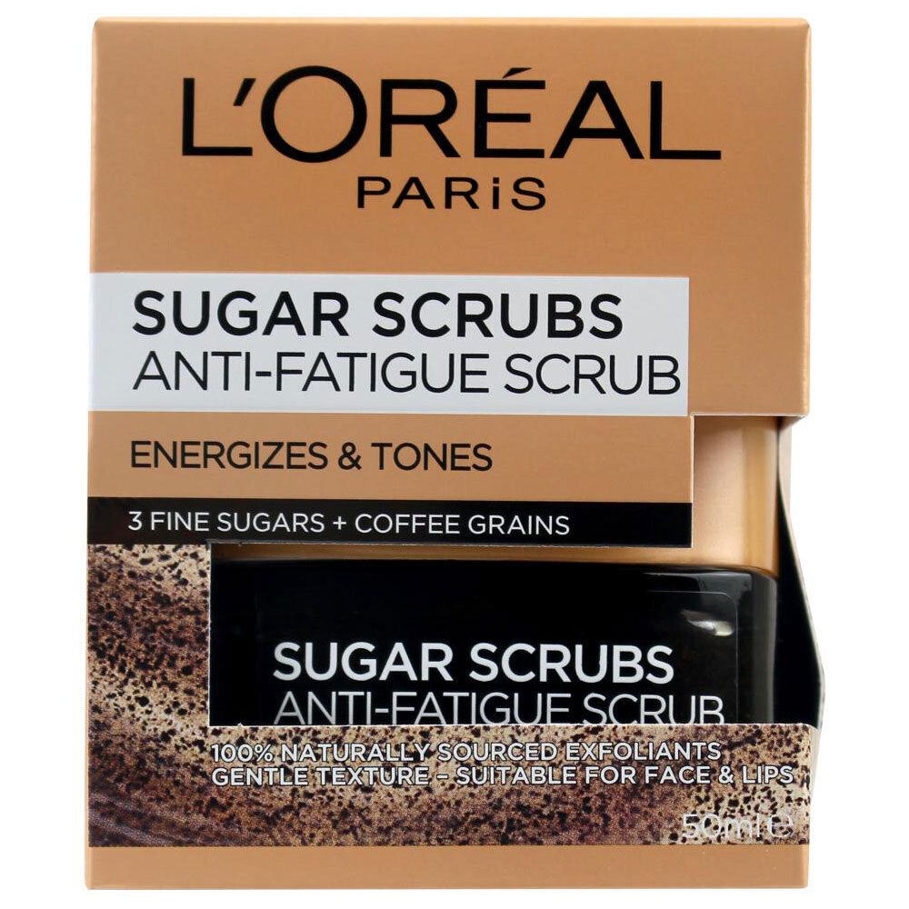 The L'Oréal Paris® Sugar Scrubs Anti-Fatigue Scrub combines 3 fine sugars (brown, blonde, white) with the toning properties of Coffee Grains for instantly toned, energized, and baby-soft skin.