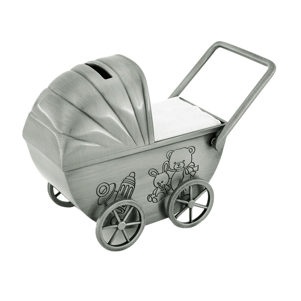 This pewter finish baby pram money bank is a treasured way to save the monetary gifts received upon the birth of a child. This money box is unique and modern. Makes the ideal baby shower, Christening or first birthday present. Saving for a time in the future when your child can enjoy the rewards is an exciting and pleasurable experience. A treasured keepsake is sure to be a well-received and highly appreciated present, proudly displayed for many years to come.