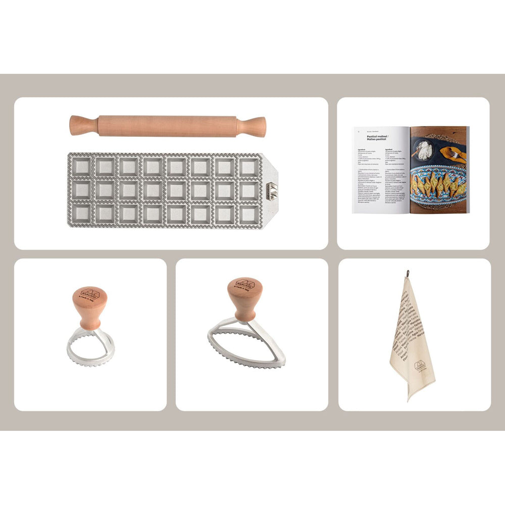 Includes a ravioli tray (24 x square), rolling pin, oval ravioli stamp, round ravioli stamp, tea towel & recipe book