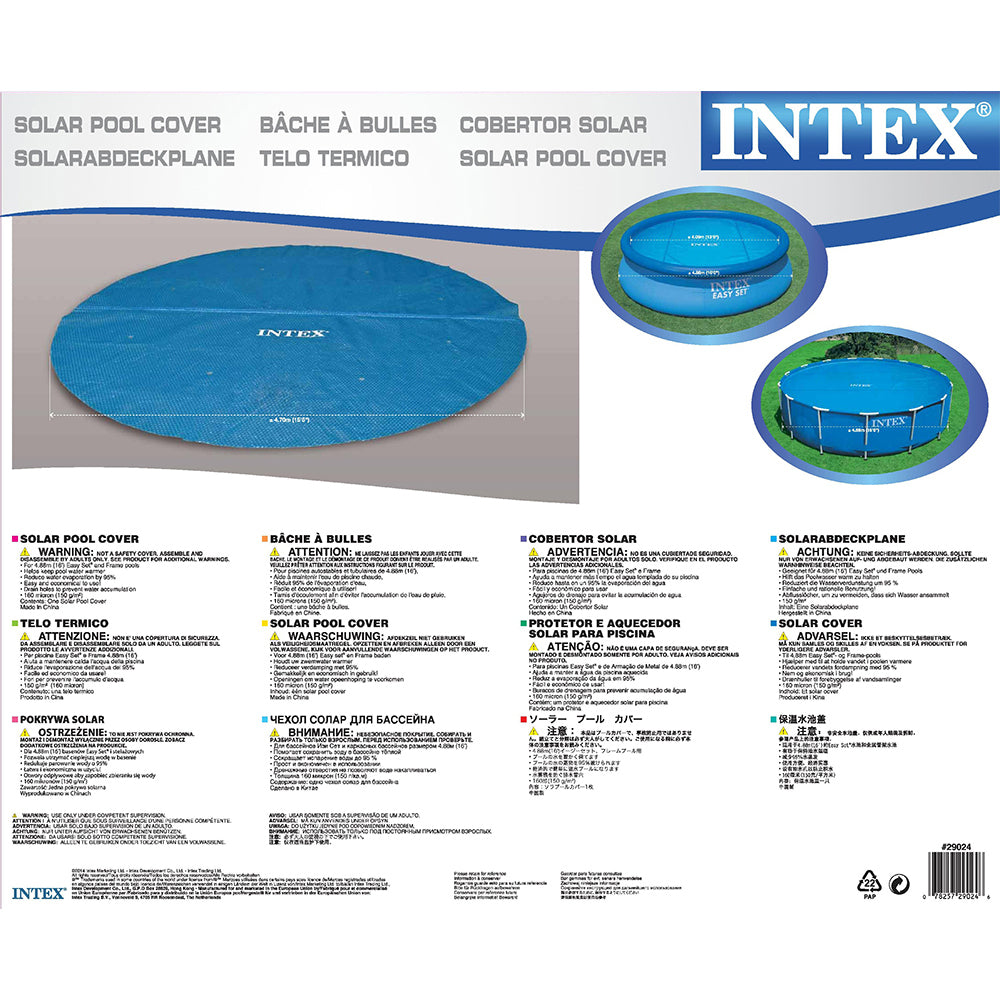 Enjoy warmer water and a longer swimming season with the Intex 16’ Solar Pool Cover. Suitable for 16’ diameter Intex round pools, this pool cover helps keep pools warmer, is easy and economical to use, and helps reduce water evaporation by up to 95%. A reusable carry bag is included for easy storage.