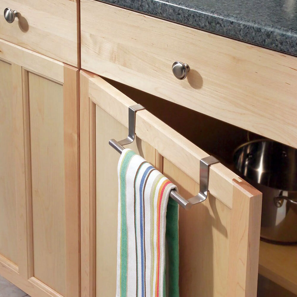 The iDesign Axis Over the Cabinet Towel Bar is the answer to all your organizational needs! This single bar towel rack is great for hanging hand towels, washcloths, cleaning, rags, pot holders, and other small items. The rack is made of strong steel with a brushed stainless steel finish for rust-proof quality that lasts. It includes non-absorbent foam backing on the hooks to protect your cabinets. There is nothing to install - just hang these over your cabinet door and they are ready to use. No nails, screws or messy adhesives needed.