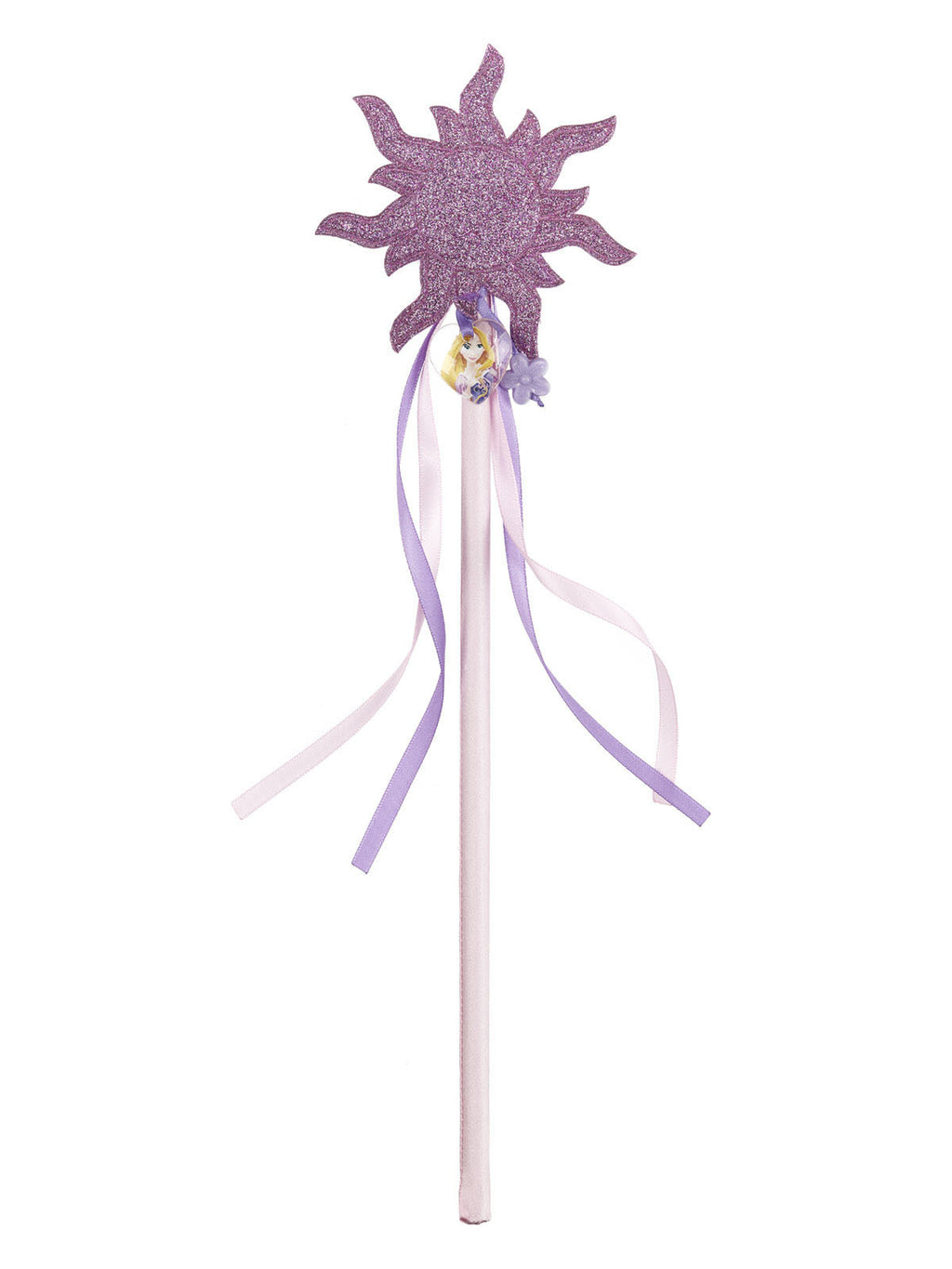 Wand features plastic character motif of Rapunzel at the base of the sun plus mauve and pale pink streamers and a plastic flower pendant