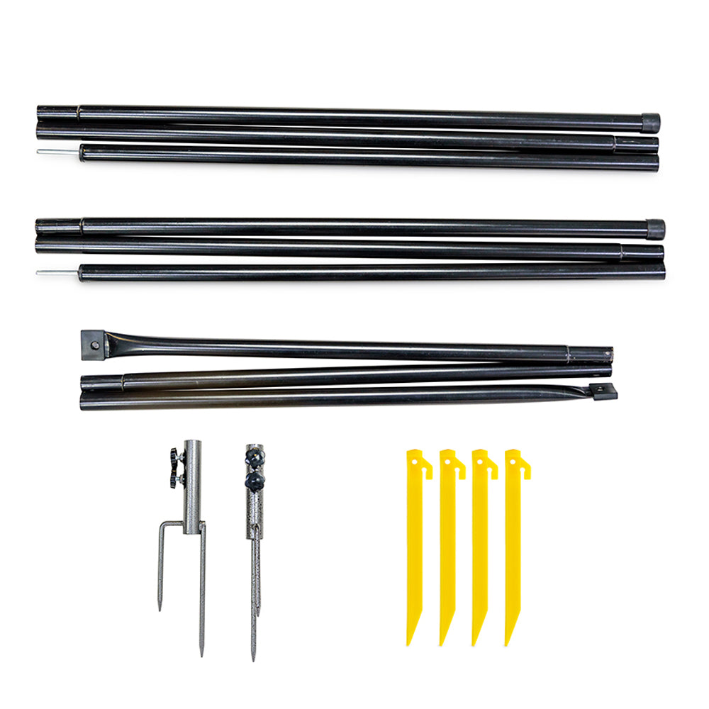 Comes with attached guy ropes, pole stabilisers and plastic sand pegs.