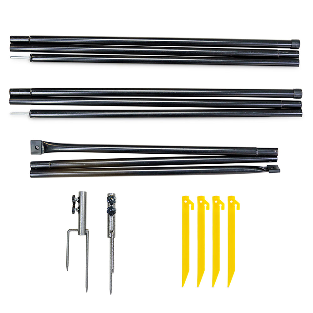 Comes with attached guy ropes, pole stabilisers and plastic sand pegs.
