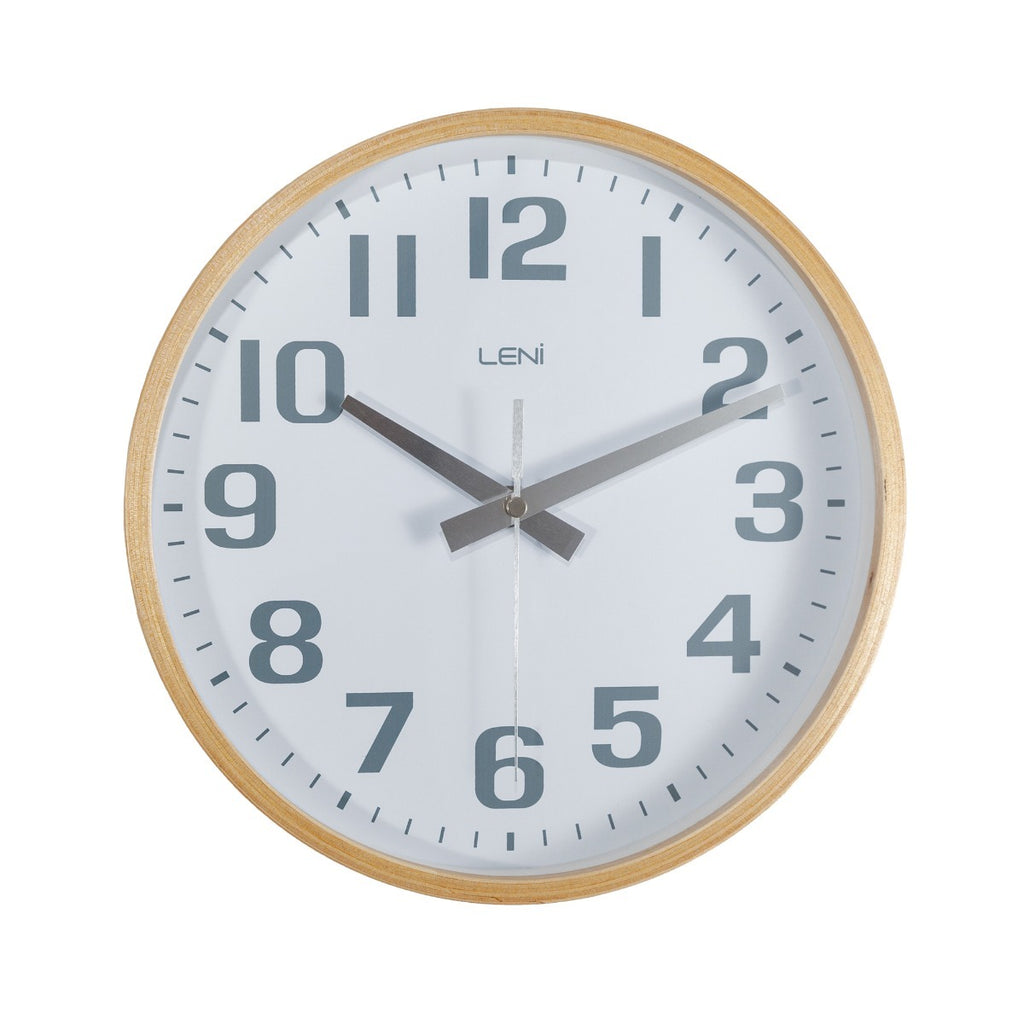A contemporary style wall clock guarantees perfect clear view with large Arabic numbers that are easy to read. This clock is made from MDF and has a glass lens that protects the dial from damage and dust.