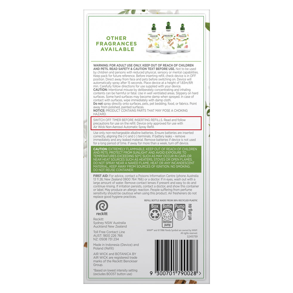 Fall in love with the Botanica by Air Wick Automatic Spray. Botanica's first ever aerosol-free auto spray is programmed to automatically spray your home with delicate fragrance for a low maintenance air freshener which welcomes you home day after day. Each refill lasts up to 70 days to deliver 24/7 freshness.