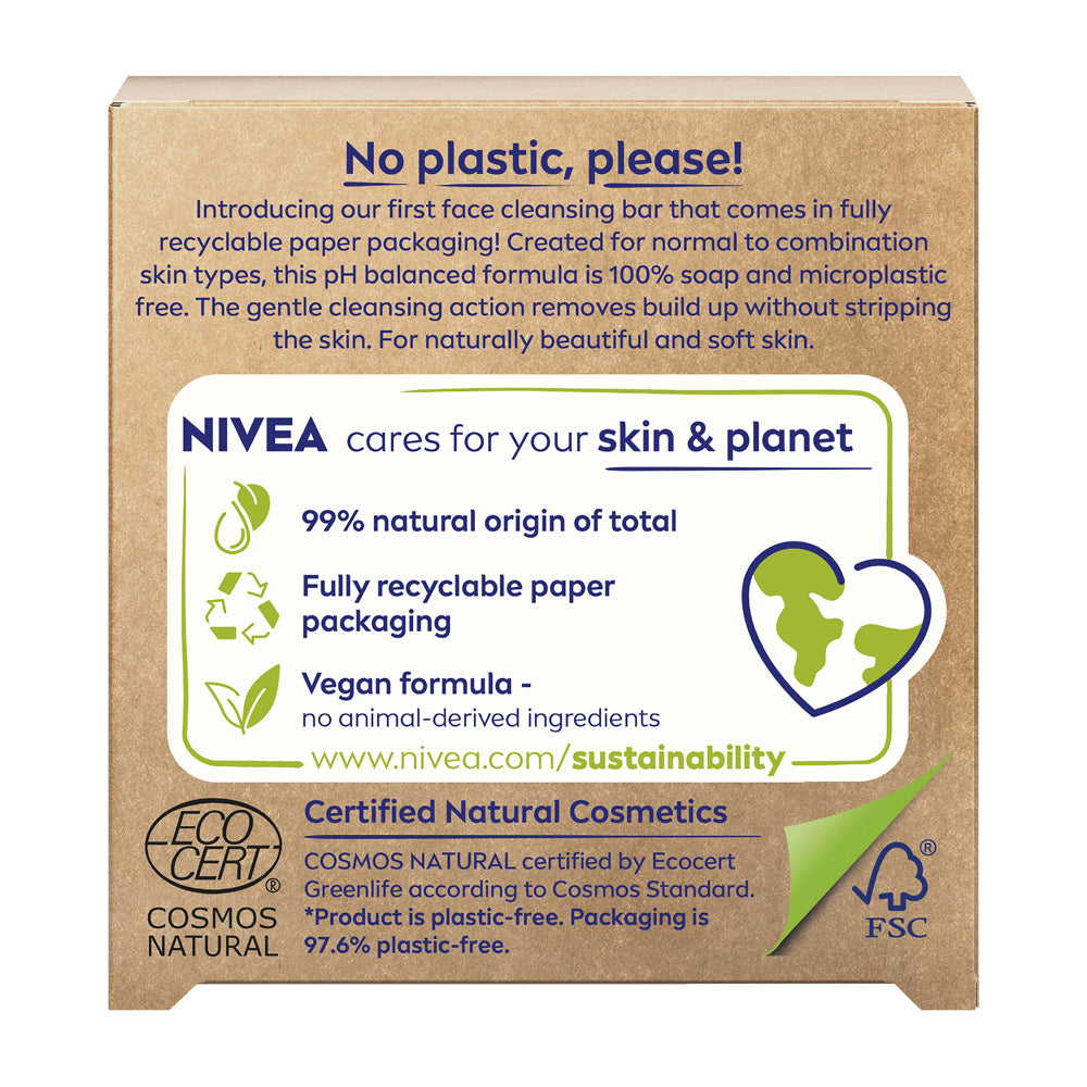 The NIVEA Wonderbar Sensitive Facial Cleansing Bar with Grape Seed Oil is a facial cleansing bar that is delicate yet effective cleanser that calms and soothes sensitised skin, optimized to your skin's pH level so that it gently cleanses your skin, leaving it soft to touch. The Scrub is fragrance free plastic-free, soap-free, certified natural 99% natural origin, fully recyclable paper packaging and vegan formula*. Wonderbar by NIVEA – natural face cleansing bars, for 100% cleansed skin.