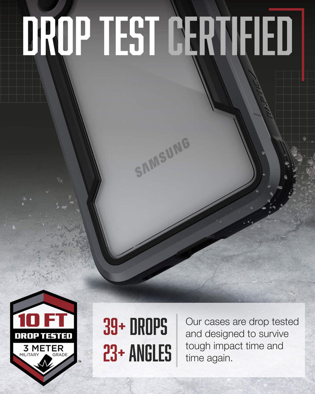 Using a combination of hard polycarbonate, soft rubber and anodized aluminum, our Defense Shield phone case is the best protection you could ever want for your Galaxy S22. We use machined metal to give your case a solid foundation that offers military-grade drop protection from six to 13 feet on concrete, while still maintaining a sleek style to match your refined-but-edgy taste. That's why we back it with clear polycarbonate so you can show off your Galaxy while keeping it safe and secure.