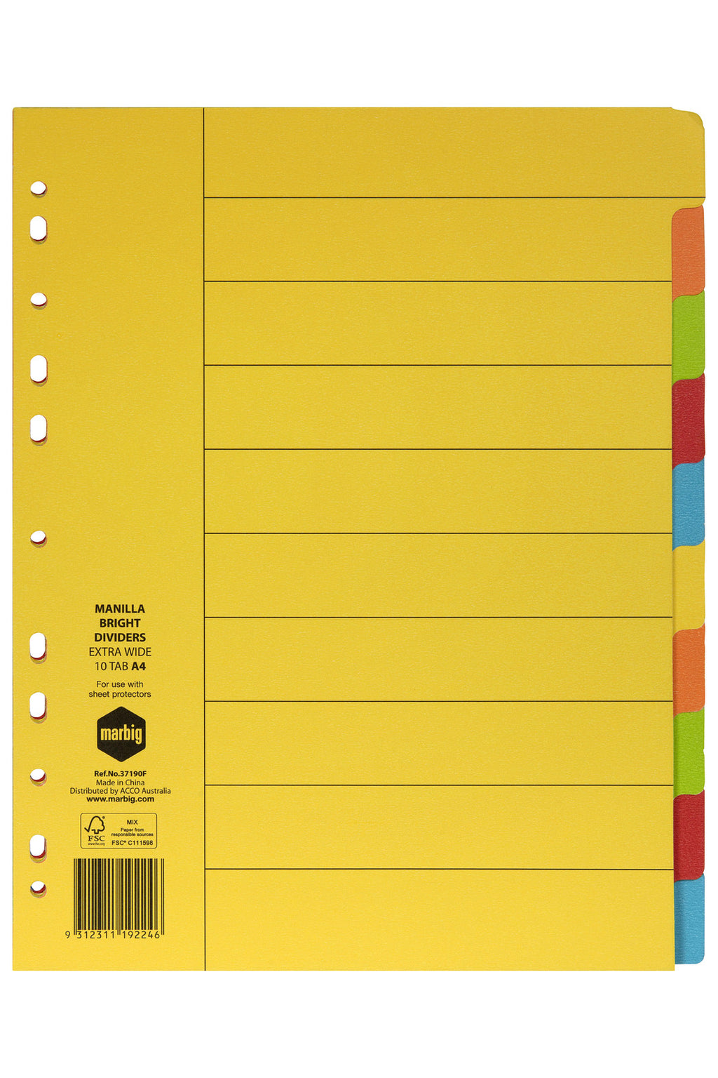 Marbig Brights Extra Wide 10-Tab Manilla A4 Ring Binder Divider