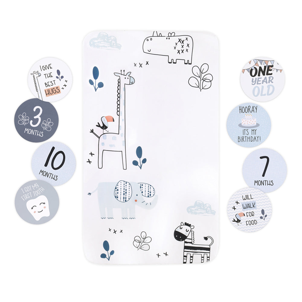 Perfect for any new parent who can't wait to photograph their little one, this playful safari themed photo op sheet and milestone card pack adds a whimsical backdrop to your photo. Document those special Milestones each Month