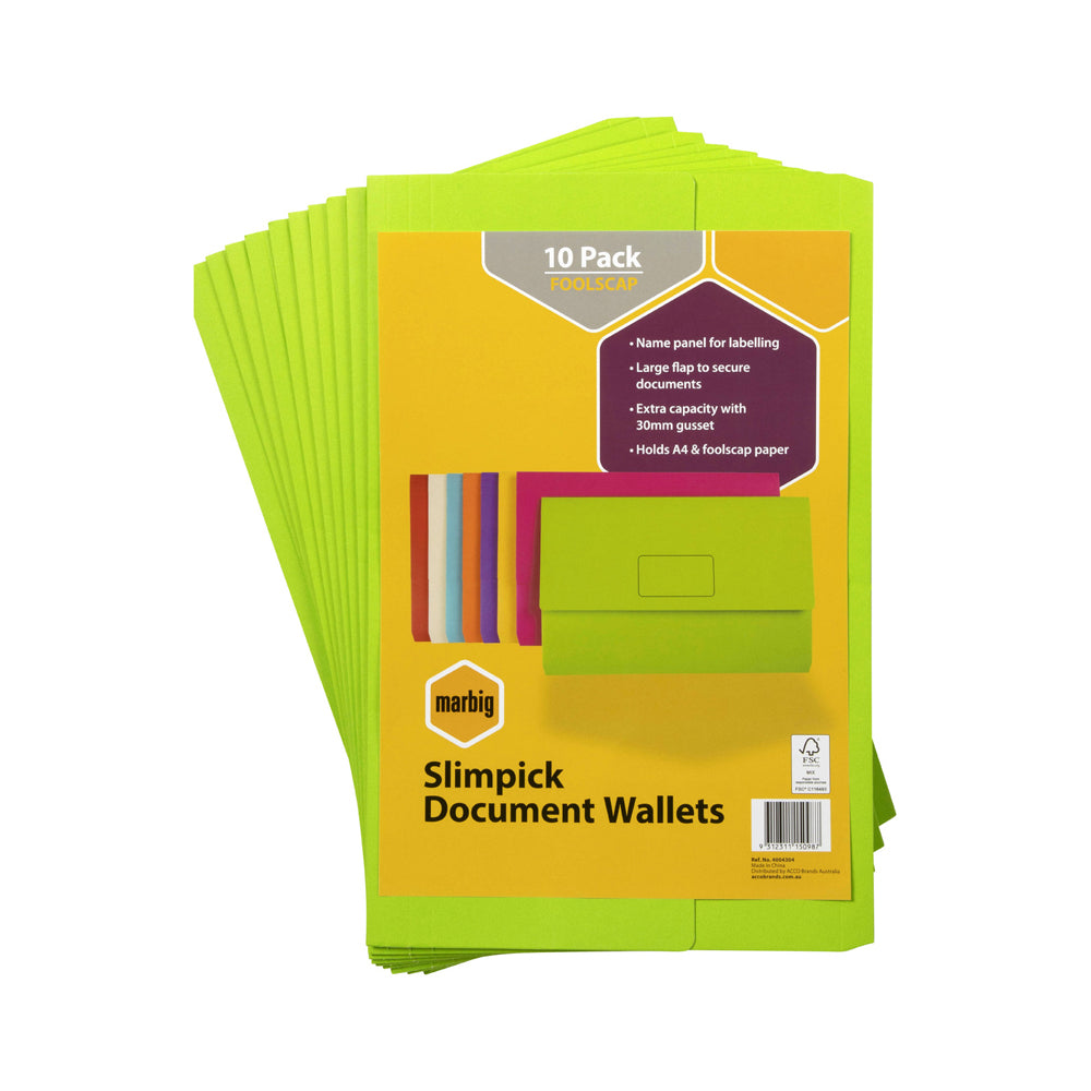 10pc Marbig Brights Slimpick Foolscap Document Wallet - Green