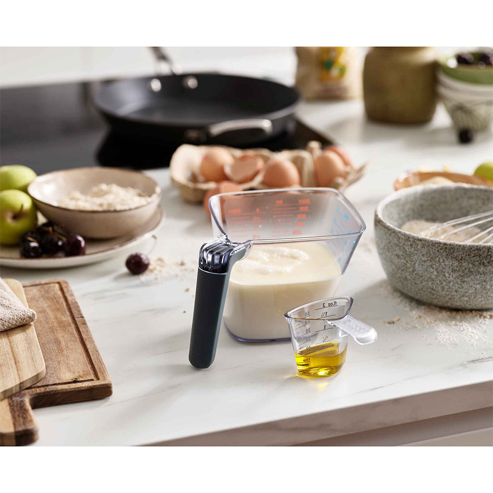 There’s no need to bend down to read this large measuring jug as it has an angled design with clear measurements, allowing you to read off the volume from above as you pour. It comes with a mini jug for accurately measuring smaller amounts and this clips into the handle for neat, space-saving storage. Both jugs feature easy-pour corners. Volumes/measurements: Large jug: up to 1 litre/4 cups/1¾ pints/32 fl. oz.; Mini jug: up to 50 ml/2 fl oz. Hand wash only.