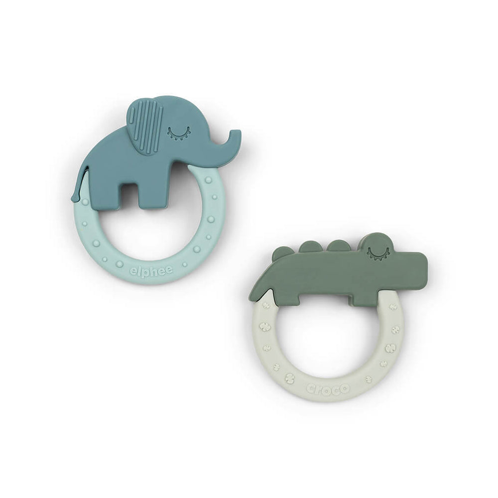 Description: Set with two soft silicone teethers shaped as the Deer friends Croco and Elphee. The teethers are easy for little hands to hold and the different shapes and textures will help stimulate and soothe itchy gums. The cute teething toys are made of soft food grade silicone and can be cleaned in the dishwasher or sterilized with boiling water. Pop them in the fridge to cool down and they can provide extra relief for sensitive baby gums. The teether set is designed to fit even the tiniest hand and stimulates both the visual, oral, and tactile senses of the baby. Shades of soft powder and mustard, fun textures and the cute elephant and fun crocodile makes this set the perfect first toy.