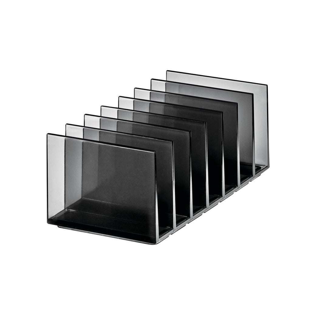 The iDesign Makeup Palette Organizer by Sarah Tanno is the fashion-forward way to store your beauty products. This collaboration with Global Artistry Director of Haus Laboratories and makeup artist, Sarah Tanno, was created for cosmetic organization without sacrificing style. Constructed with care from Eco-friendly, BPA-free PET plastic, the sleek smoke gray finish with complementing black accents is as long-lasting as it is visually stunning. This 7-compartment palette organizer comes with seven dividers to store your eyeshadow, highlighter, blush, contour, and lip palettes. The open and raised design allows you to store your favorite palettes upright and within reach. To customize your cosmetic layout, you can coordinate the Palette Organizer with other items from the iDesign Signature Series by Sarah Tanno.