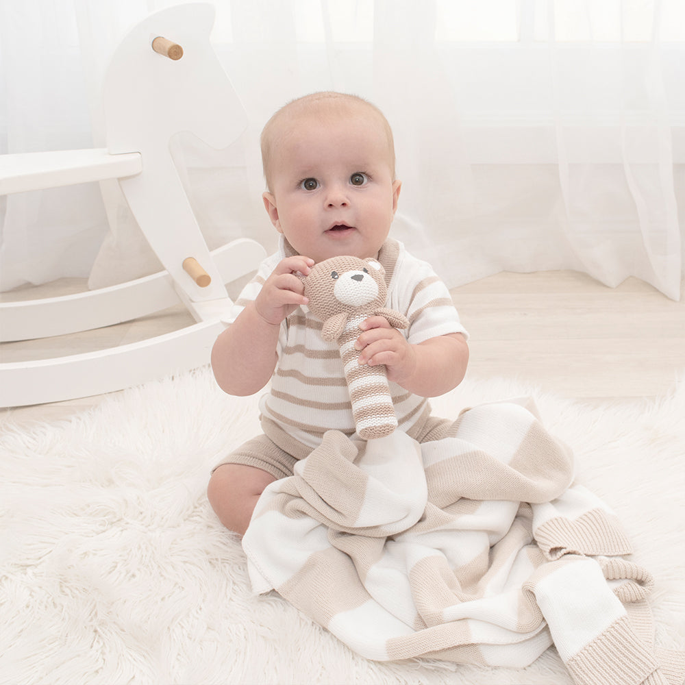 Made from 100% cotton knit with embroidered features, it’s small enough to pop in the nappy bag to keep baby entertained with out and about.