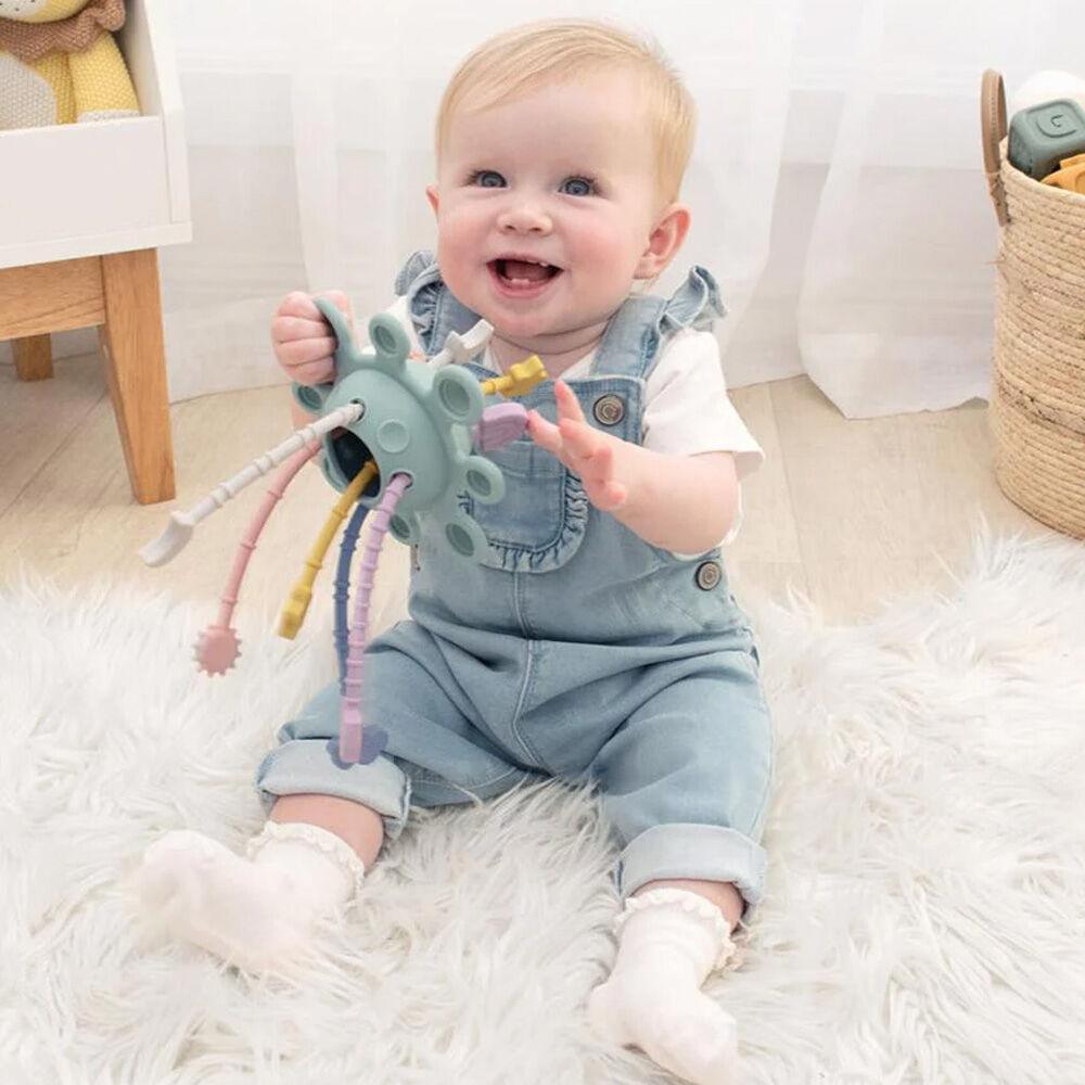Made from BPA Free, food grade silicone, the Playground Zippy is perfect for enhancing your baby's motor skills and sensory development! Designed to promote tactile responses through pulling and pushing, it features fun pop-it elements and multiple silicone strings for baby to pull and tug at. With its creative design and interactive features, it's perfect for keeping little ones entertained when out and about.