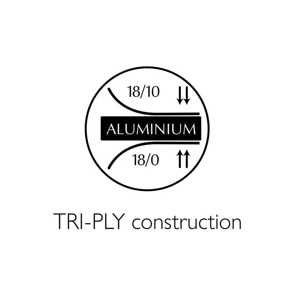 TRI-PLY construction. Premium 18/10 stainless steel interior, rapid heat conducting aluminium core and magnetic stainless steel exterior. Supreme heat distribution and durability