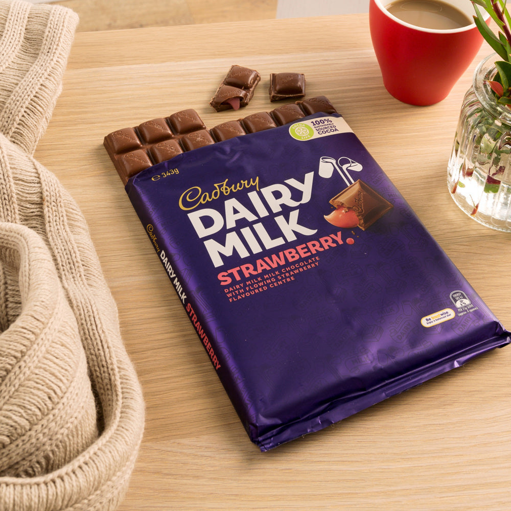 Our large block of Dairy Milk milk chocolate with a delicious strawberry flavoured centre is perfect for sharing with the family. The equivalent of a glass and a half of full cream milk in every 200g of Cadbury Dairy Milk milk chocolate.