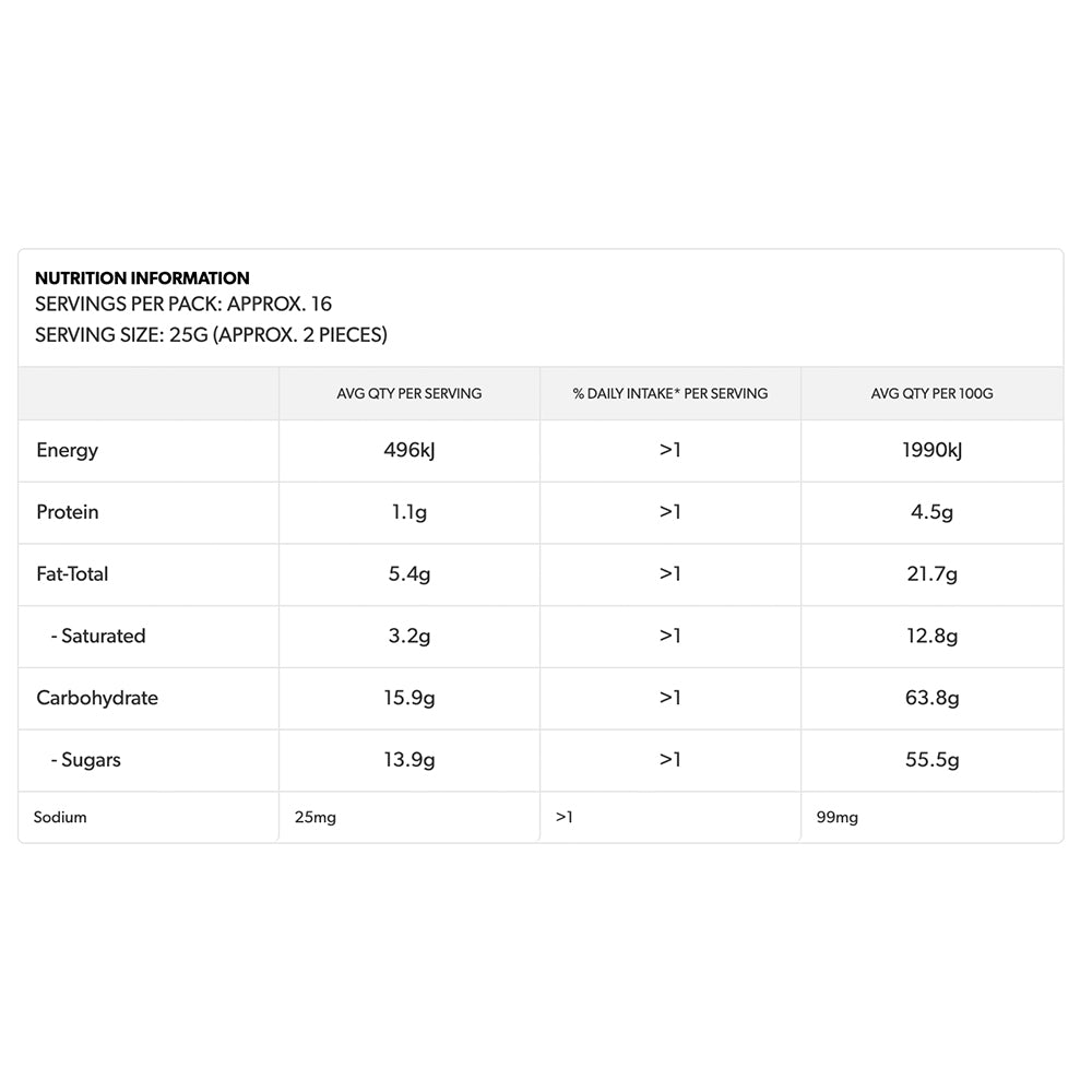 Flavours: Classic Milk, Strawberry Crème, Orange Crème, Peppermint Crème, Hazelnut Swirl, Passionfruit Delight, Classic Caramel, Turkish Delight, Vanilla Nougat, Carmel Deluxe.