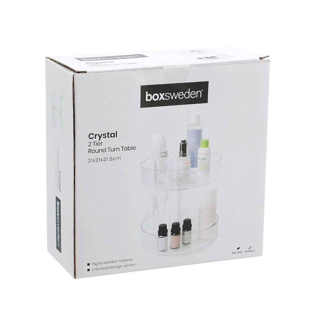 Keep your cosmetics and essentials organised with our Boxsweden Crystal 2-Tier Turntable! The durable, BPA-free design features a 360-degree rotating base for easy access, making it the perfect addition to your bathroom storage.