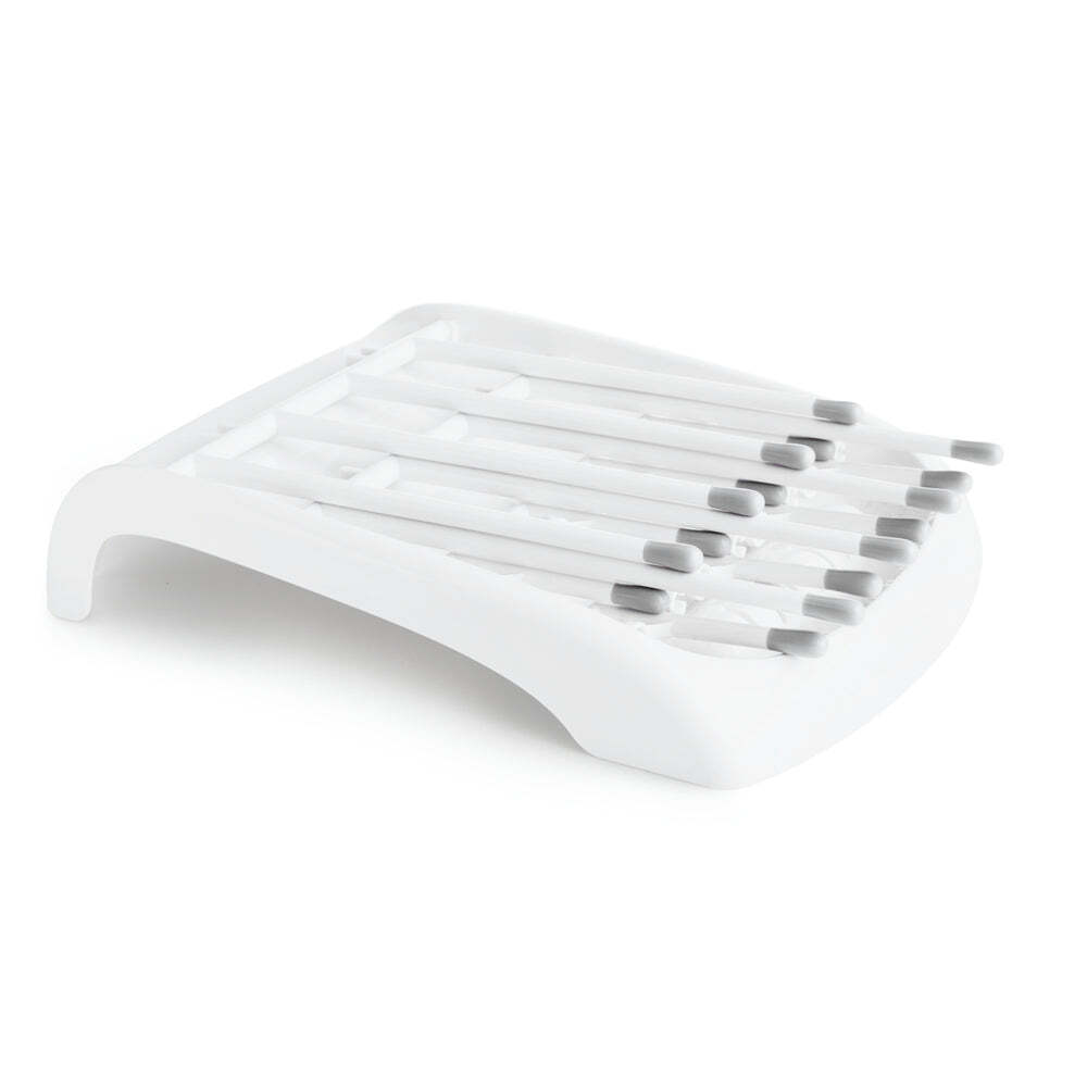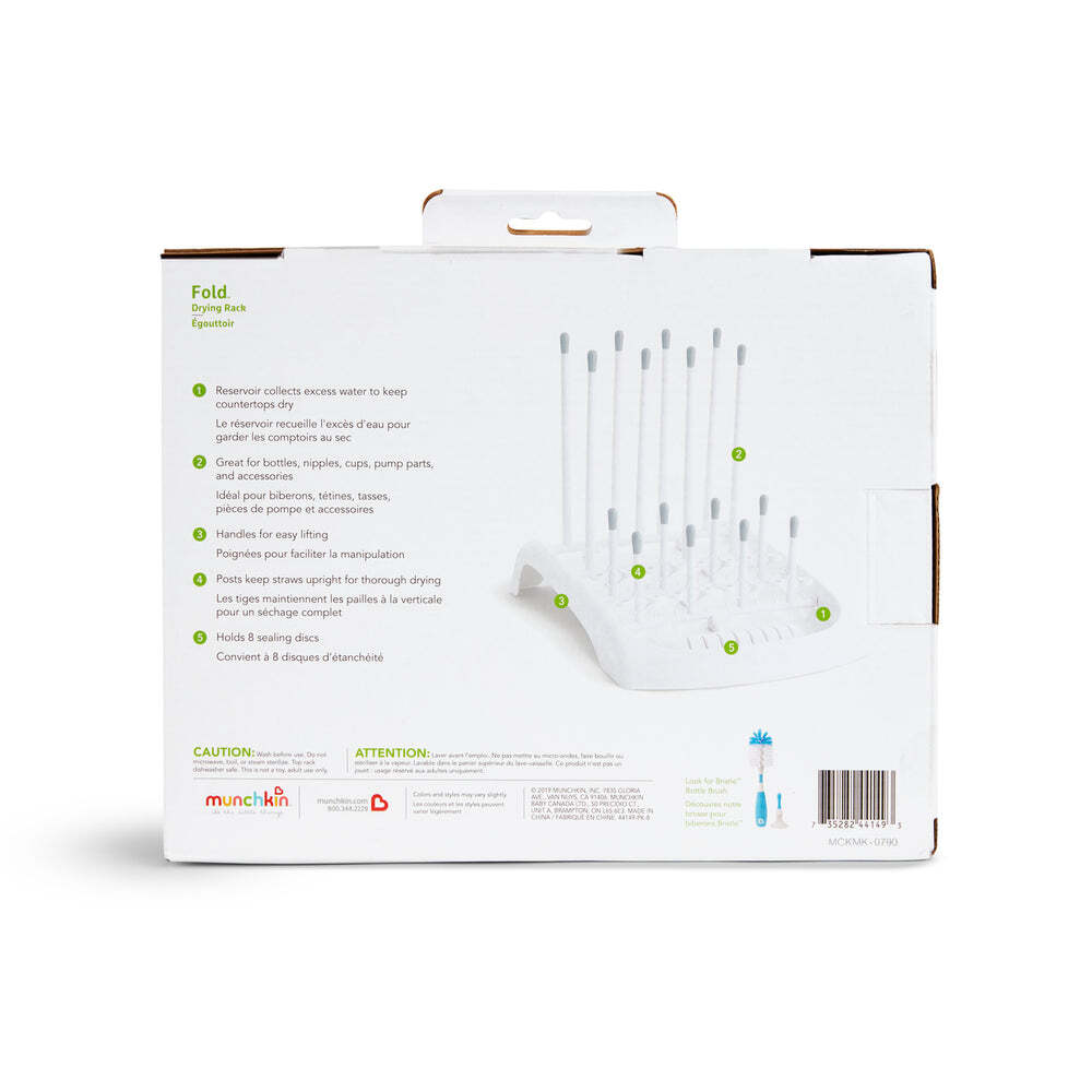 Let’s face it: nothing works as well as air drying those freshly washed baby bottles and cups. Our Fold™ Drying Rack helps keeps your kitchen counters clutter-free and your feeding accessories dry. Ideal for use with bottles, nipples, cups, straws, valves, pump parts and more. Two peg heights accommodate all bottle and accessory sizes, and a slotted row holds 8 standard and wide-mouth sealing discs upright. The pegs fold flat for easy storage and have rounded tips to prevent scratching, while the built-in reservoir collects excess water to keep countertops dry. Easy-to-grasp handles allow for easy lifting, and there’s absolutely no assembly required. This drying rack is a bottle washing must.