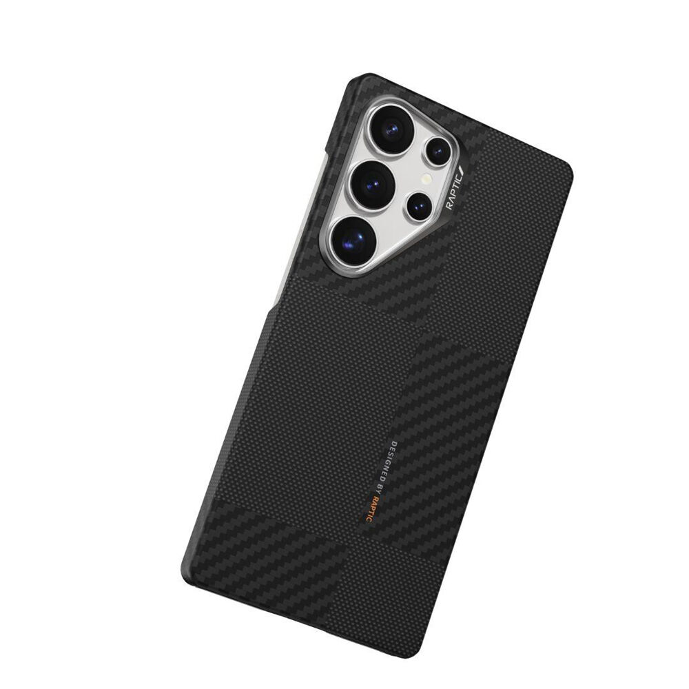 The Raptic Aramid Msafe case for the Samsung Galaxy S25 made of hard polycarbonate, soft rubber, and anodized aluminium, and it provides military-grade protection. The case has a sleek and edgy design with a clear polycarbonate back to show off the phone.