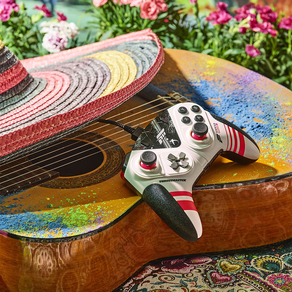 Experience incredibly immersive racing with the gamepad, thanks to the brand-new RACING WHEEL MODULE. Master your trajectories and drifts, and stay in control on any type of terrain with the module’s 95° rotation angle and non-slip surface FOR FORZA HORIZON 5 FANS Hit the road and discover Mexico with ESWAP XR PRO CONTROLLER decked out in the colors of Forza Horizon 5. Slip on your racing gloves and put the pedal to the metal with this officially-licensed Xbox and Forza Horizon 5 gamepad. NEXT-LEVEL IMMERSION You’ll really feel like you’re driving, thanks to a truly game-changing experience with the new RACING WHEEL MODULE included with ESWAP XR PRO CONTROLLER FORZA HORIZON 5 EDITION. With the module’s re-centering system and 95° rotation angle, you’ll experience a whole new level of immersion — with incredible control of your turns and drifting. YOUR DRIVING STYLE Hot-Swap technology lets you swap modules at any time, to adapt the gamepad to your gameplay — and not the other way around. ESWAP XR PRO CONTROLLER FORZA HORIZON 5 EDITION includes RACING WHEEL MODULE, two mini-sticks and a D-pad. Swap modules in a snap, for the setup that suits you best at any given time! BECOME AN ACE AT THE WHEEL Combining enhanced precision with an extended lifespan of 2 million activations, the next-generation S5 NXG mini-sticks and RACING WHEEL MODULE represent an excellent balance between driving precision, control of your trajectories and overall immersion. EXTRAORDINARY RESPONSIVENESS You’ll love the super-responsive clicks provided by the mechanical buttons, which are 64% faster than standard membrane-based buttons (tested under laboratory conditions). Say goodbye to lagging response times in games: with an activation distance reduced to 0.01 inches / 0.3 mm, you’ll be able to respond quickly and take control in your races! CONFIGURE YOUR GAMEPAD Adjust the sensitivity and other settings of the mini-sticks, RACING WHEEL MODULE and the triggers with the ThrustmapperX software. When RACING WHEEL MODULE is inserted, the D-pad inputs are automatically assigned to the rear buttons (1, 2, 3, 4). ThrustmapperX is available for Windows, and accessible directly via the Xbox menu!