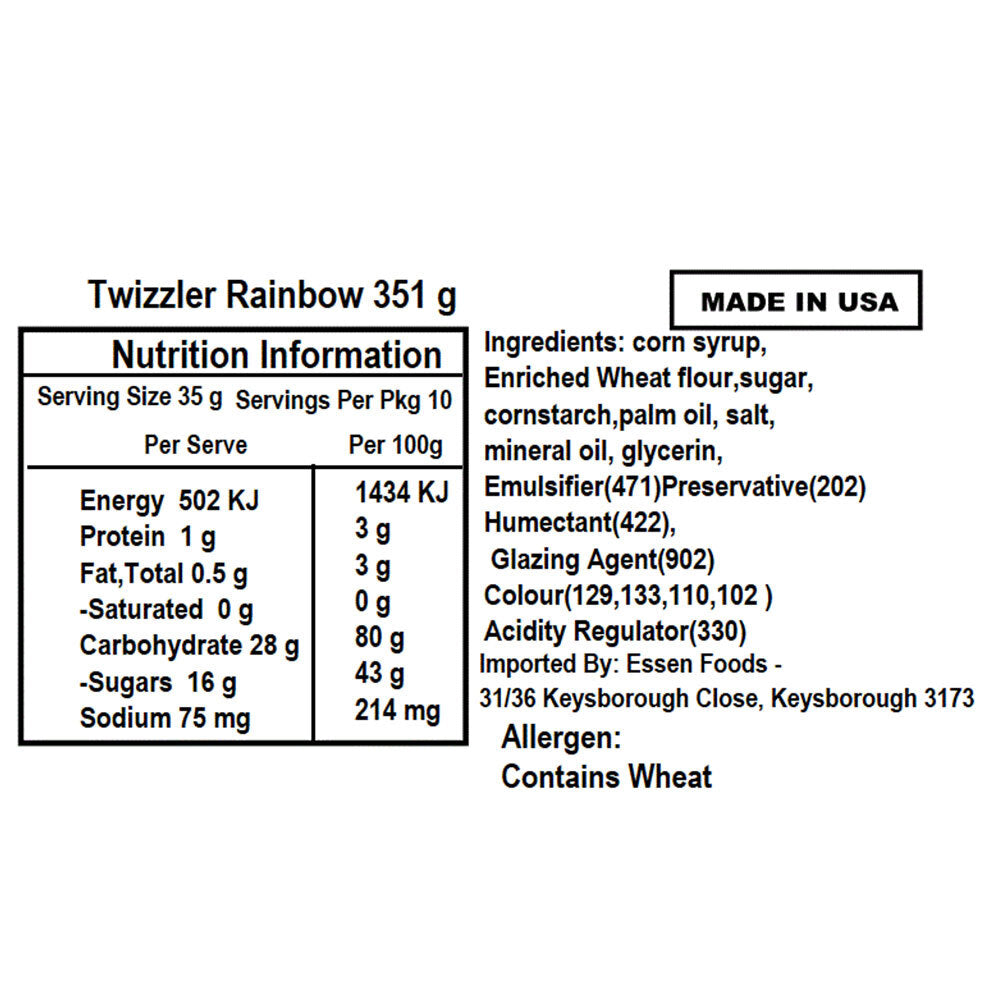 Corn syrup, Enriched Wheat flour, sugar, cornstarch, palm oil, salt, mineral oil, glycerin, Emulsifier(471)Preservative(202) Humectant(422), Glazing Agent(902) Colour(129,133,110,102 ) Acidity Regulator(330)