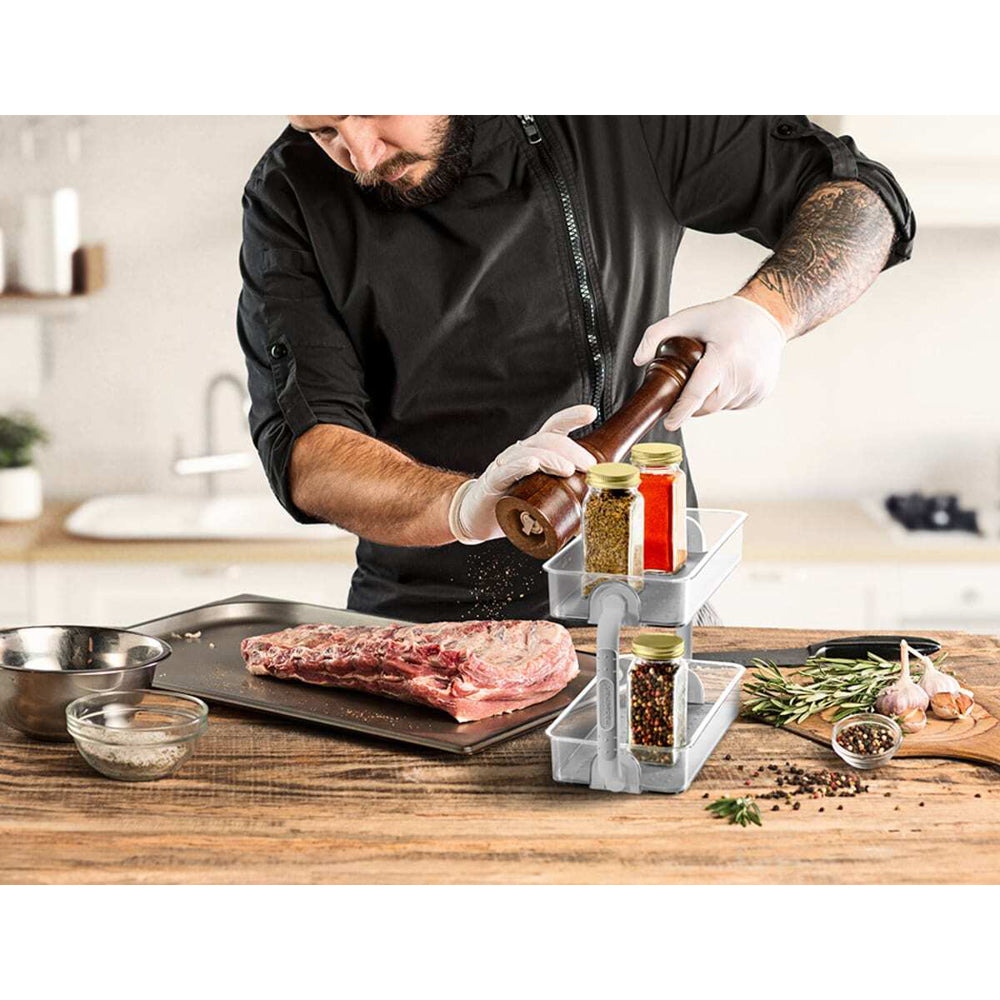 The Madesmart ® Two-Tier Spice Organiser maximises vertical space, and is perfectly sized to fit in your pantry or cupboards.Features include soft-grip lining to keep spices in order and two sturdy handles for easy portability.