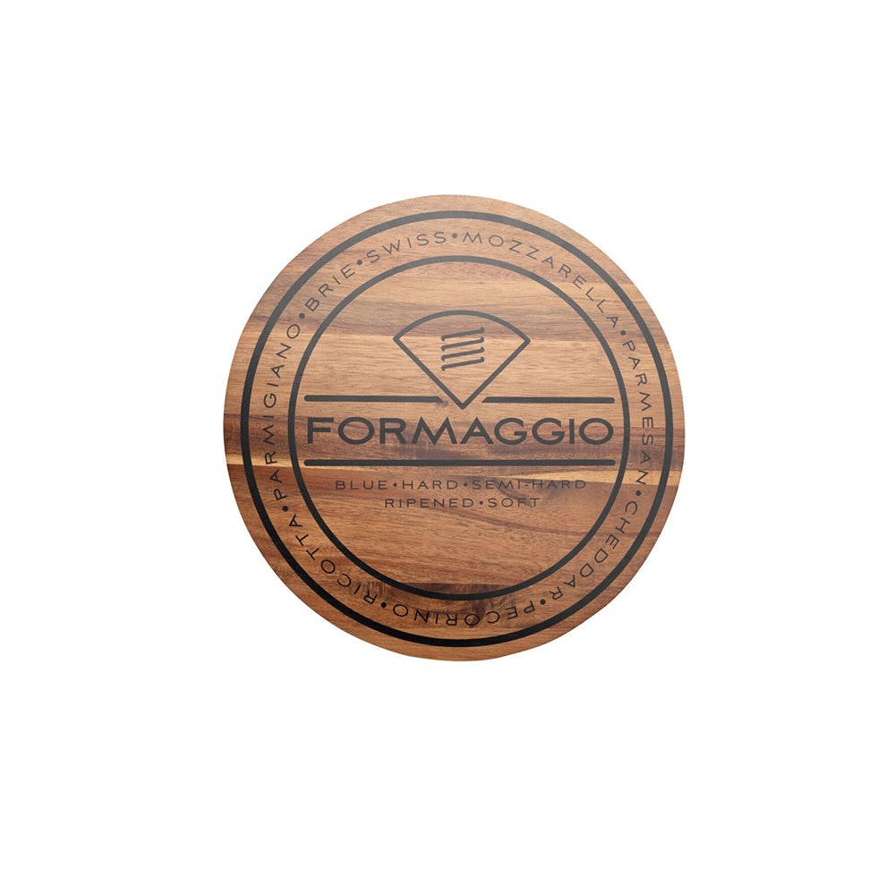 - Inscribed with different cheese varieties around the rim