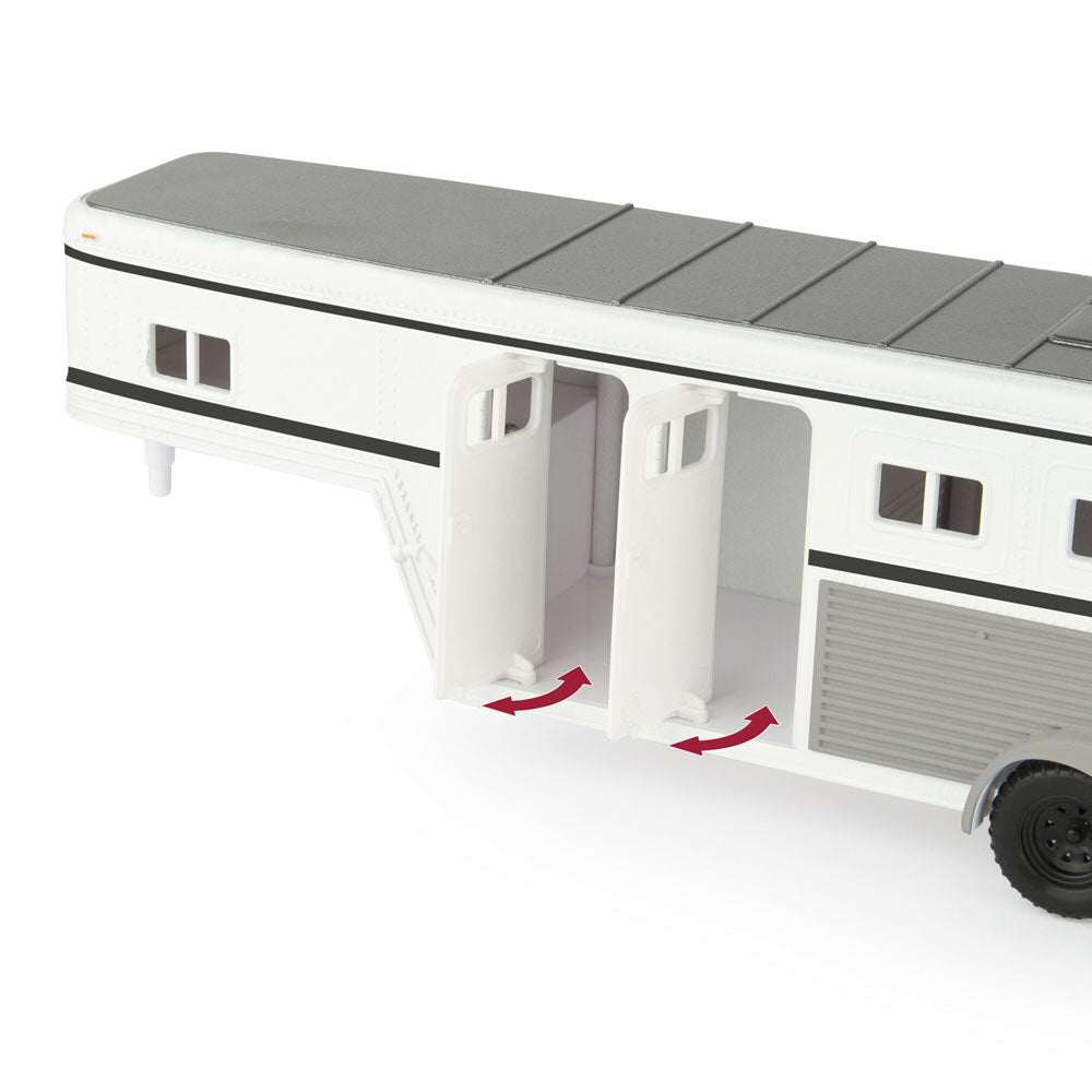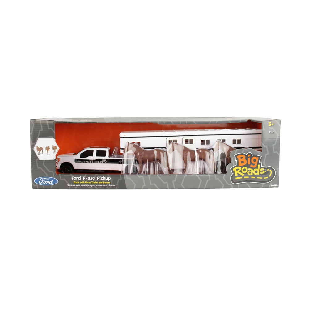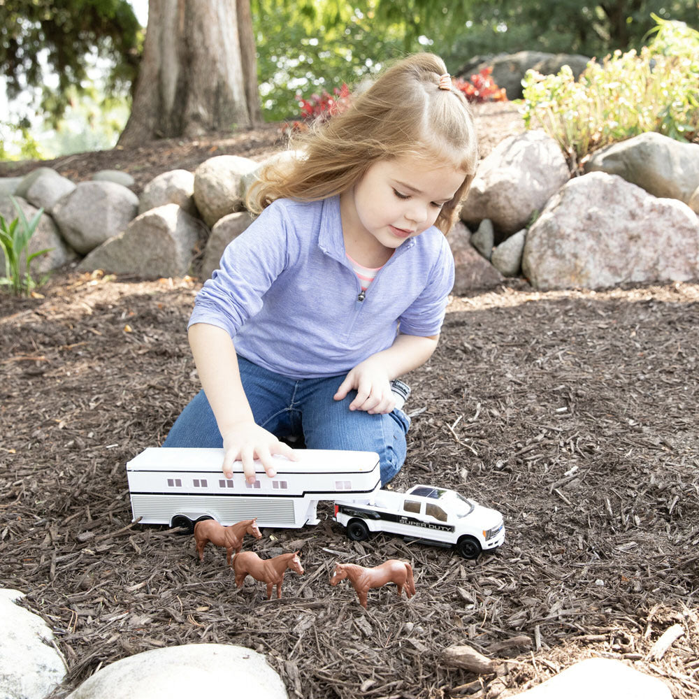 Playtime at the ranch wouldn't be complete without horses! The Ford F-350 Pickup with 5th wheel trailer includes 3 horses for real loading, hauling and unloading fun. At 1:32 scale, this toy pickup and trailer are the perfect size for both indoor and outdoor play. Hook up the trailer, load the horses, and play all day!
