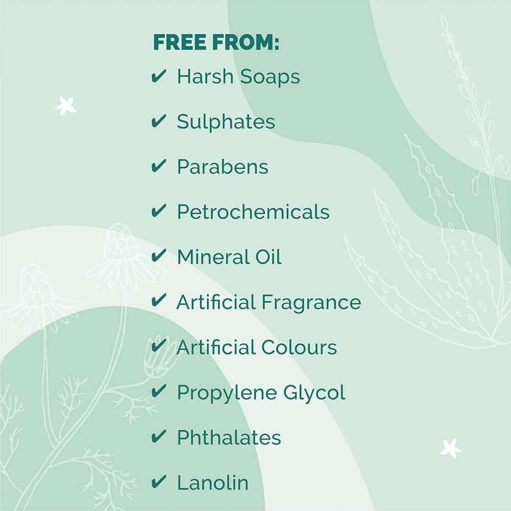 Free from: Harsh soaps, sulphates, parabens, petrochemicals, mineral oil, artificial fragrance, artificial colours, synthetic preservatives, propylene glycol, phthalates, lanolin