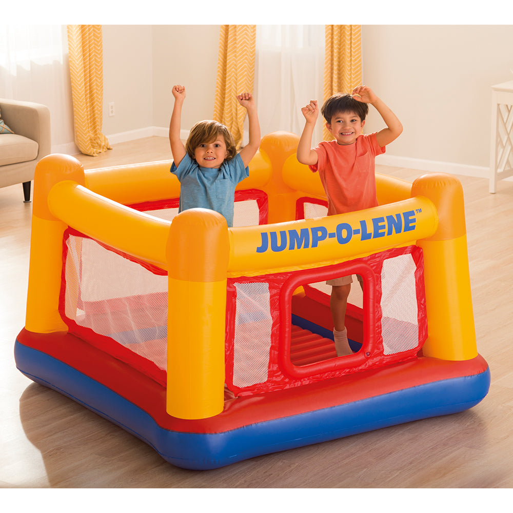 Perfect for jumping and playing, the Intex Playhouse Jump-o-Lene™ is a great play gym for young kids to enjoy for hours on end. This colorful bouncer comes equipped with a crawl-thru door for kids to easily crawl inside. Reinforced net sidewalls provide a safe enclosed play area. An inflatable floor and high sidewalls provide a safe bouncing platform.