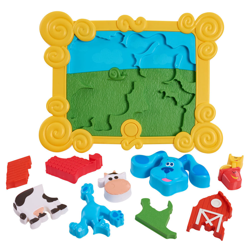 An interactive puzzle that is made from plastic material features a colourful barn and some of kids' favourite friends which include Blue, Shovel, Mailbox and Pail.