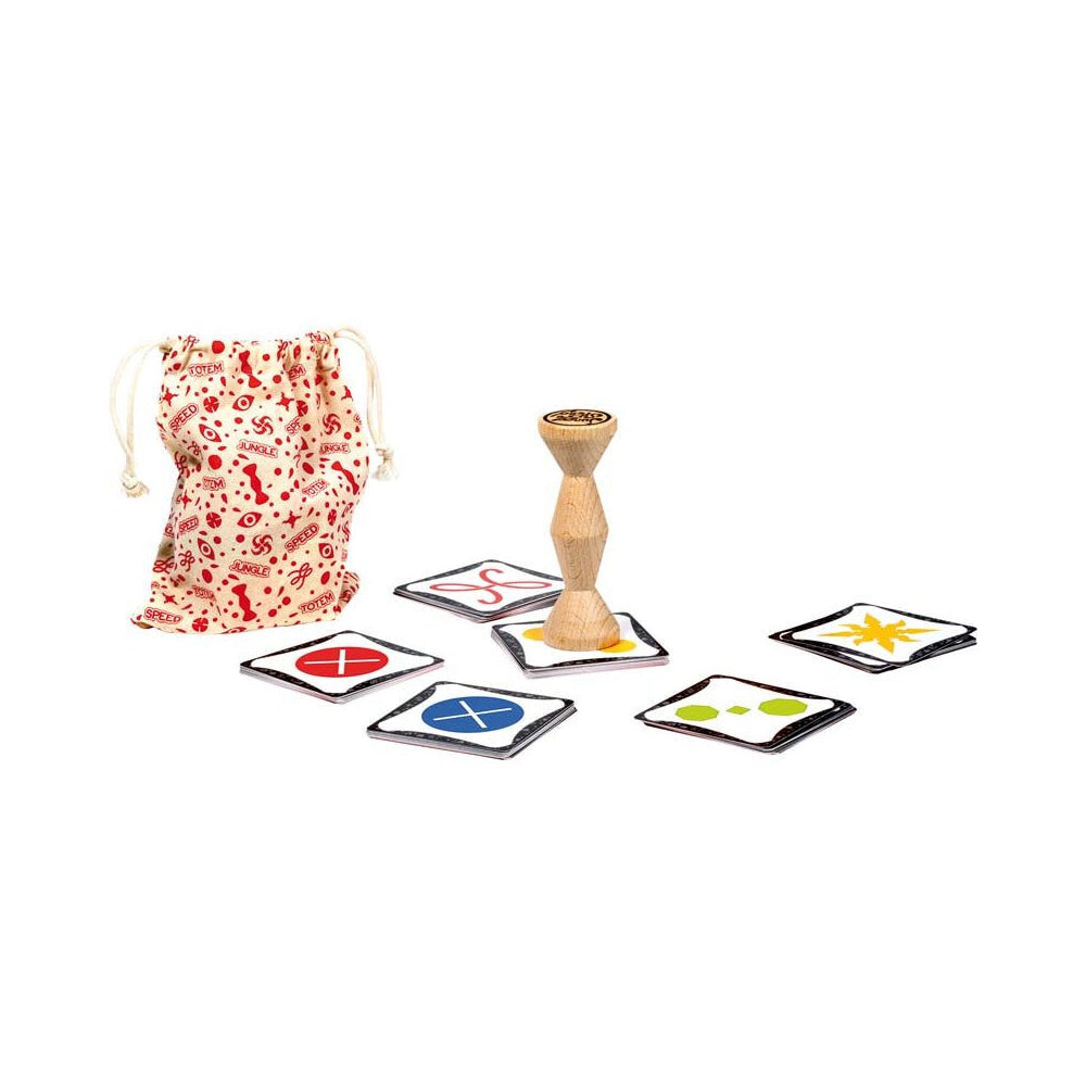 In Jungle Speed, you must rely on your keen sense of observation and quick reflexes. It requires a steady hand -- which can be hard to maintain during the many fits of maniacal laughter! The wooden Totem sits in the middle of the table, waiting for the player with the fastest reflexes to snatch it up and win the game.