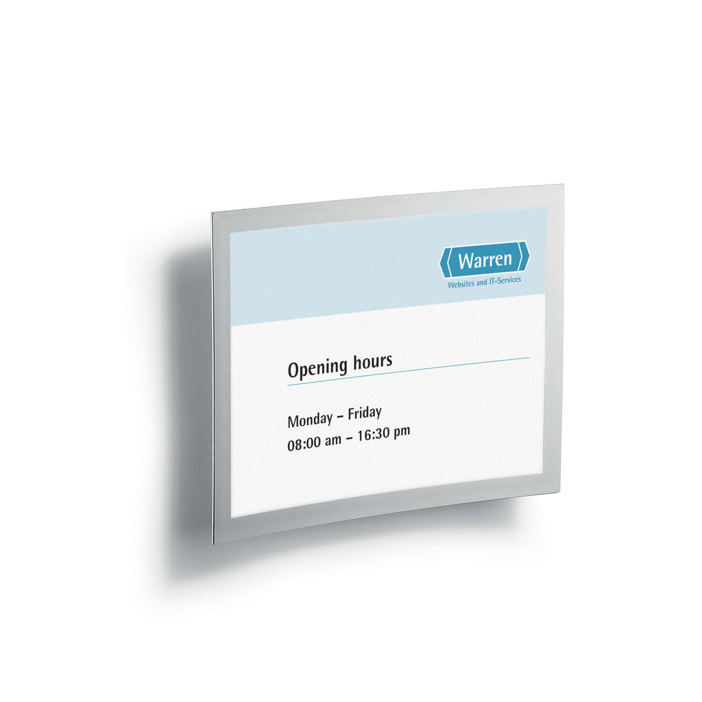 Mobile information system for application on walls. For display of information materials in A4 formats. Quick exchange of information materials through detachable DURAFRAME® MAGNETIC frame in silver. Can be used in either portrait or landscape format.